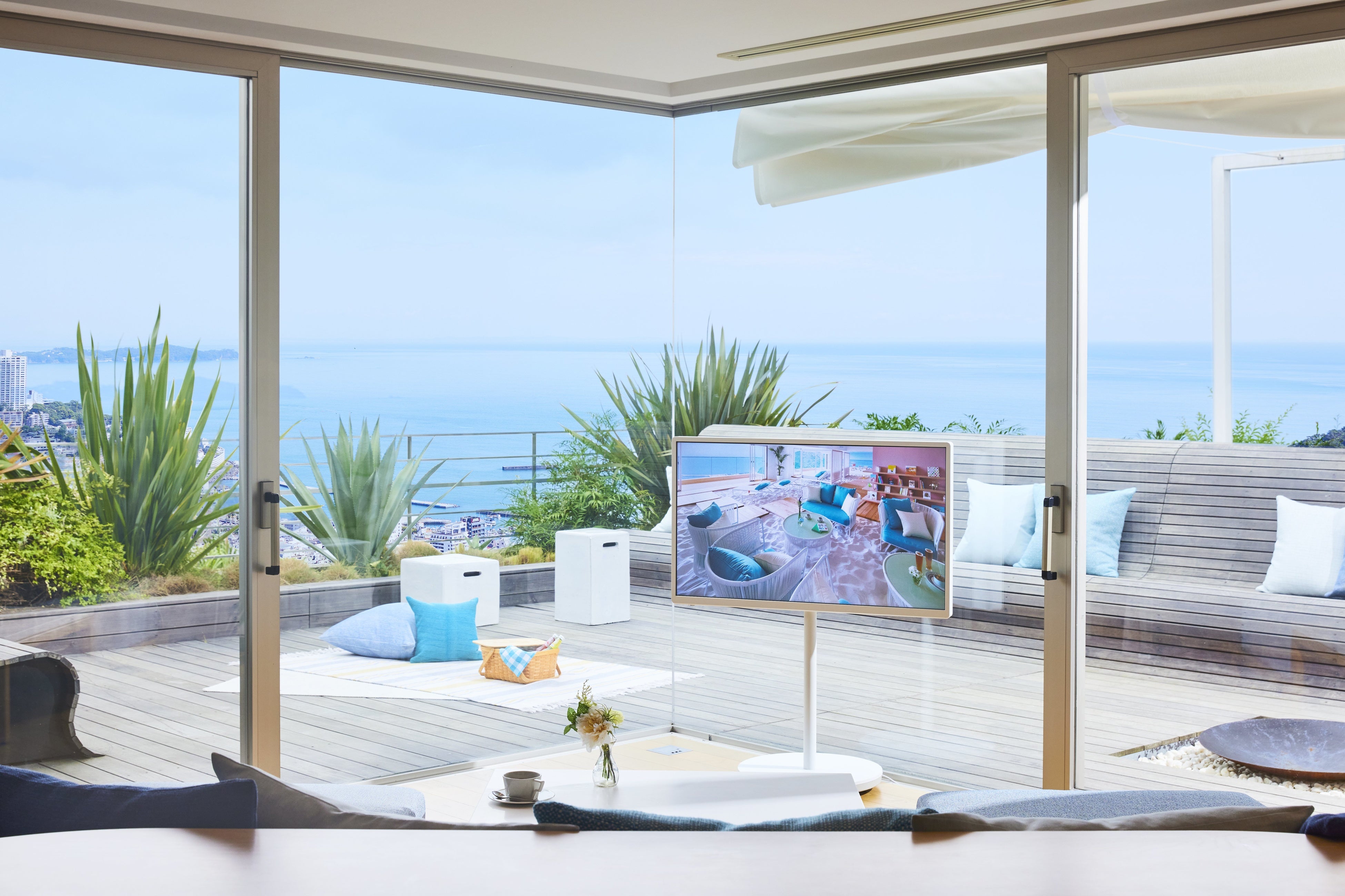 360度どこから見ても美しく、スタイリッシュなデザインのこのテレビは、リゾナーレ熱海のスイートルームともフィットし、100㎡以上あるお部屋のどの位置からでも見やすいようにかんたんに移動ができます。お部屋でゆっくりお過ごしの際に、ぜひご利用ください。