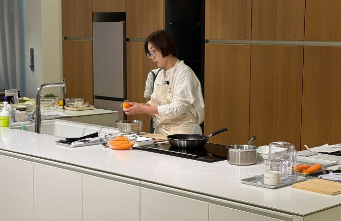 基本のにんじんしりしりからブロッコリーを使った本格的な緑のミネストローネなど有賀さんにご考案いただいたレシピを、「SELECT100」のキッチン用品を使い、デモンストレーションしていただきました。有賀さんは、いい道具を選ぶには「実際に手に取って触ってみて、自身の手に合った道具を選ぶことが重要。」と語り、手に合ったもので調理することでストレスなく気持ちよく料理ができ、キッチンの中で楽しさを感じられるとお話しされました。また、実際に調理するだけでなく、準備から片づけまでが料理であるため、「洗いやすさや収納のしやすさといった要素も、いい道具を選ぶ際には重要。」とお話しされました。