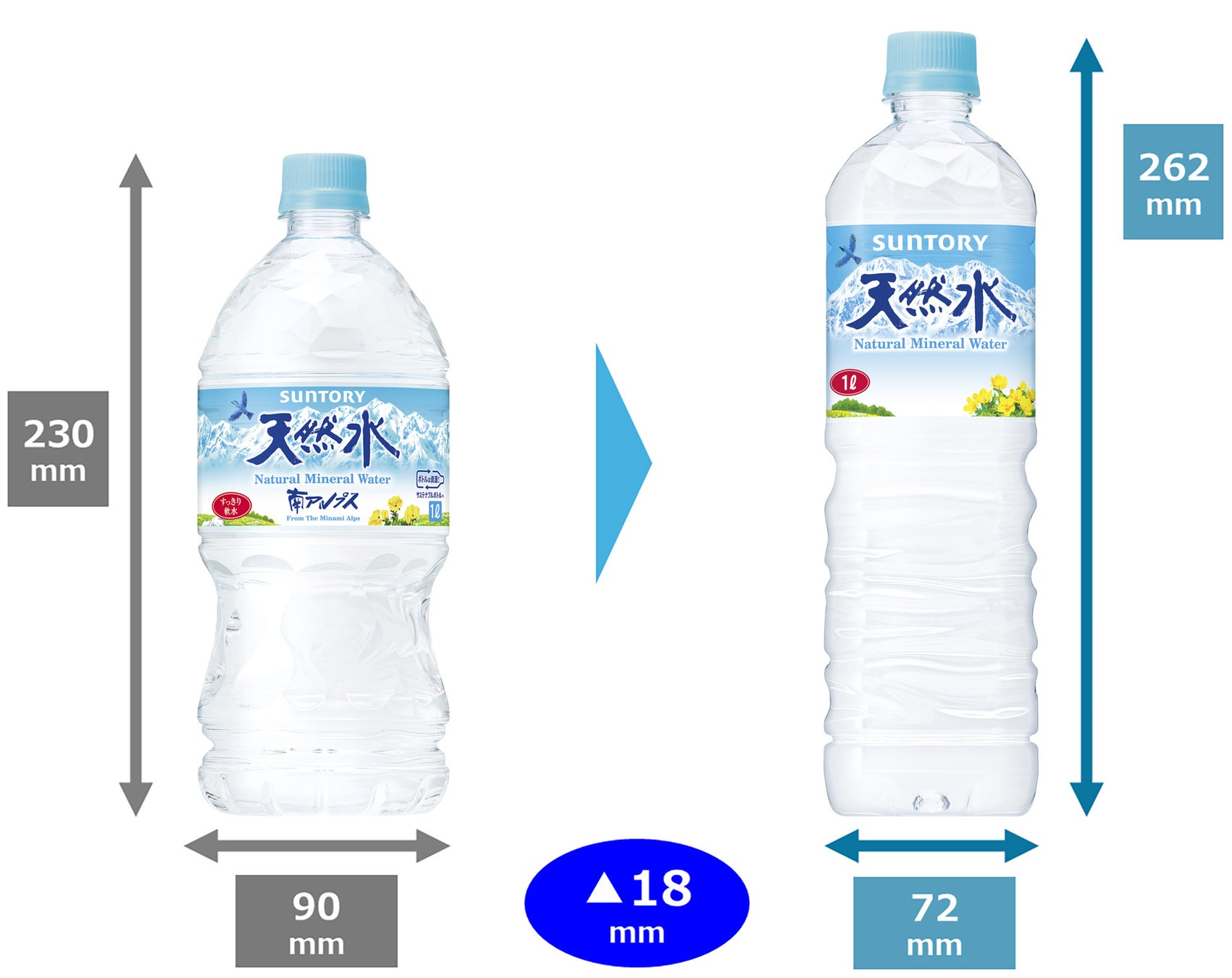 そこで今回、「サントリー天然水」1Lのペットボトルを、ご家庭向けの中容量サイズという考え方から、一人でたくさん飲みたい方向けの“パーソナル大容量”という考え方に発想を転換し、容器を刷新します。「サントリー天然水」らしい清冽さを維持したまま、片手で持って直接飲用しやすく、またリュックのサイドポケットなどにも入れて持ち運びやすい胴径・形状へと変更します。