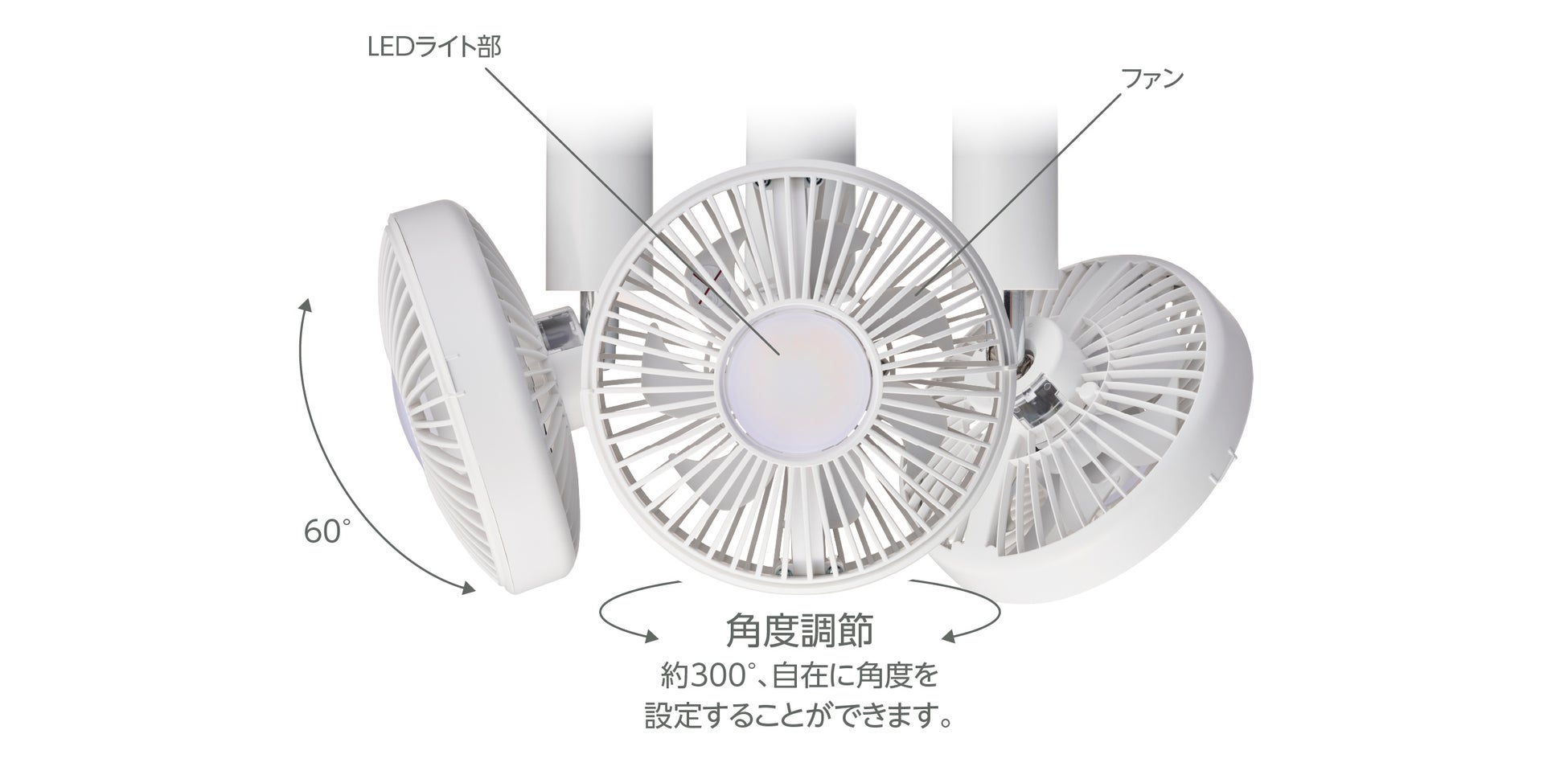 照明とファンの向きは手動で上下60°、水平方向300°と広い範囲で変える事ができます。