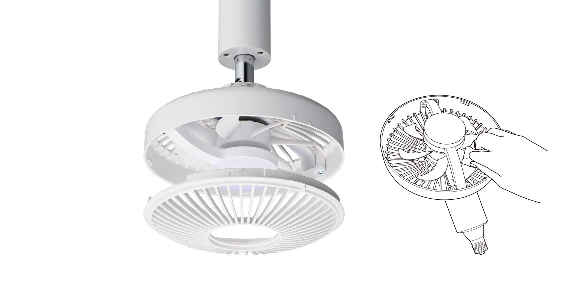 従来のソケットタイプのデザインは全体が円形で、ファンを中心部に、照明部分を円形の外側に配置していました。しかし、E17口金サイズはE26口金サイズに比べて口金直径が35%細くなっていることで、取付製品の小型軽量化を目指して、従来のデザインとは逆に、中央に照明を設置することで、外径を抑えて、従来のE26モデルの製品より約25%軽量化しました。【照明を中央に配した独自のデザイン構造設計(実用新案登録済)】