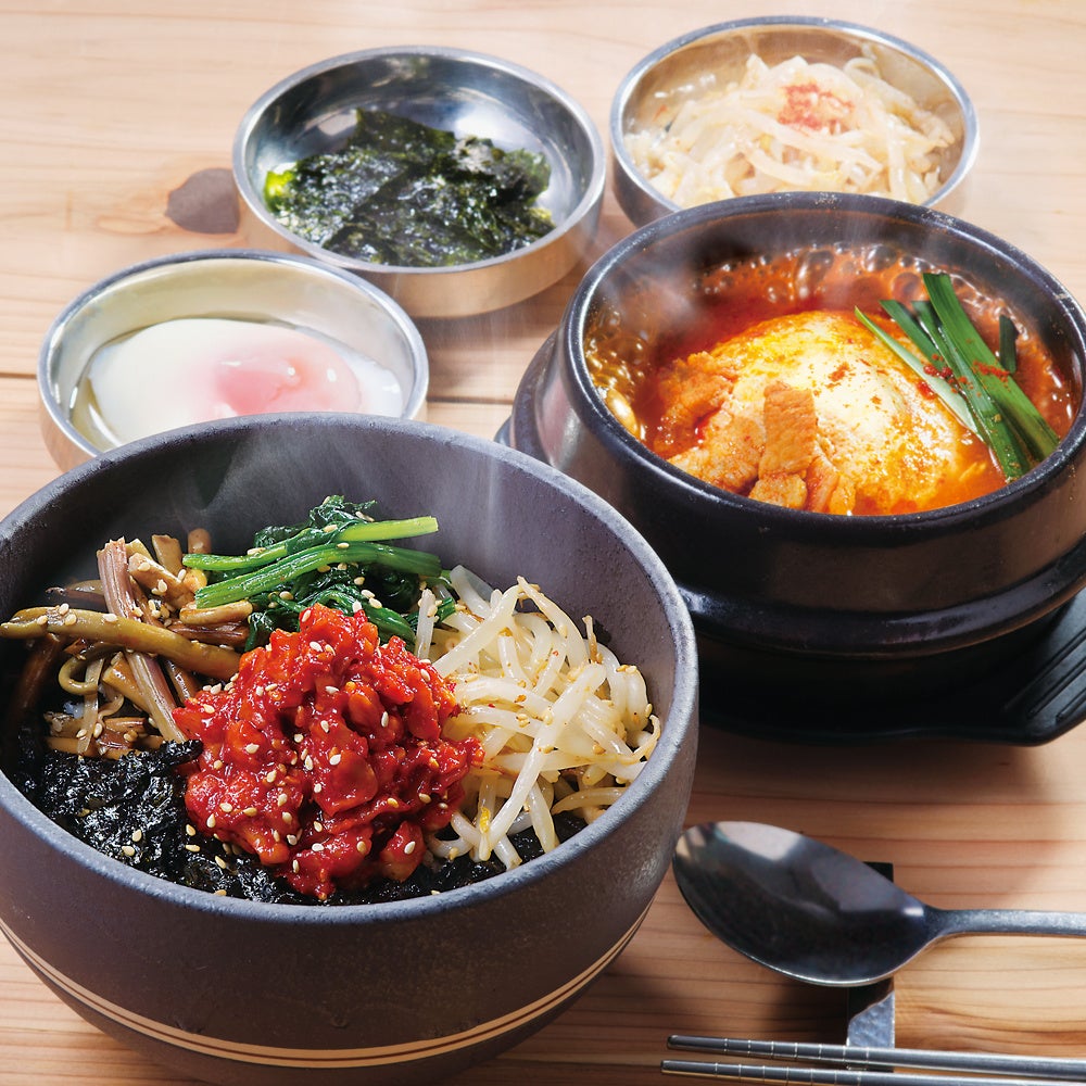 塩漬けにしたタラの胃や腸を、唐辛子がベースの調味料に漬け込んだ塩辛「チャンジャ」を3種類の野菜ナムルと盛りつけたビビンバを、辛味と旨味を味わうハーフスンドゥブと一度に楽しめる「チャンジャビビンバとハーフスンドゥブ定食」をはじめ全てのメニューは、ご自宅や職場でも専門店のお料理を味わえるテイクアウトやデリバリーも可能です。