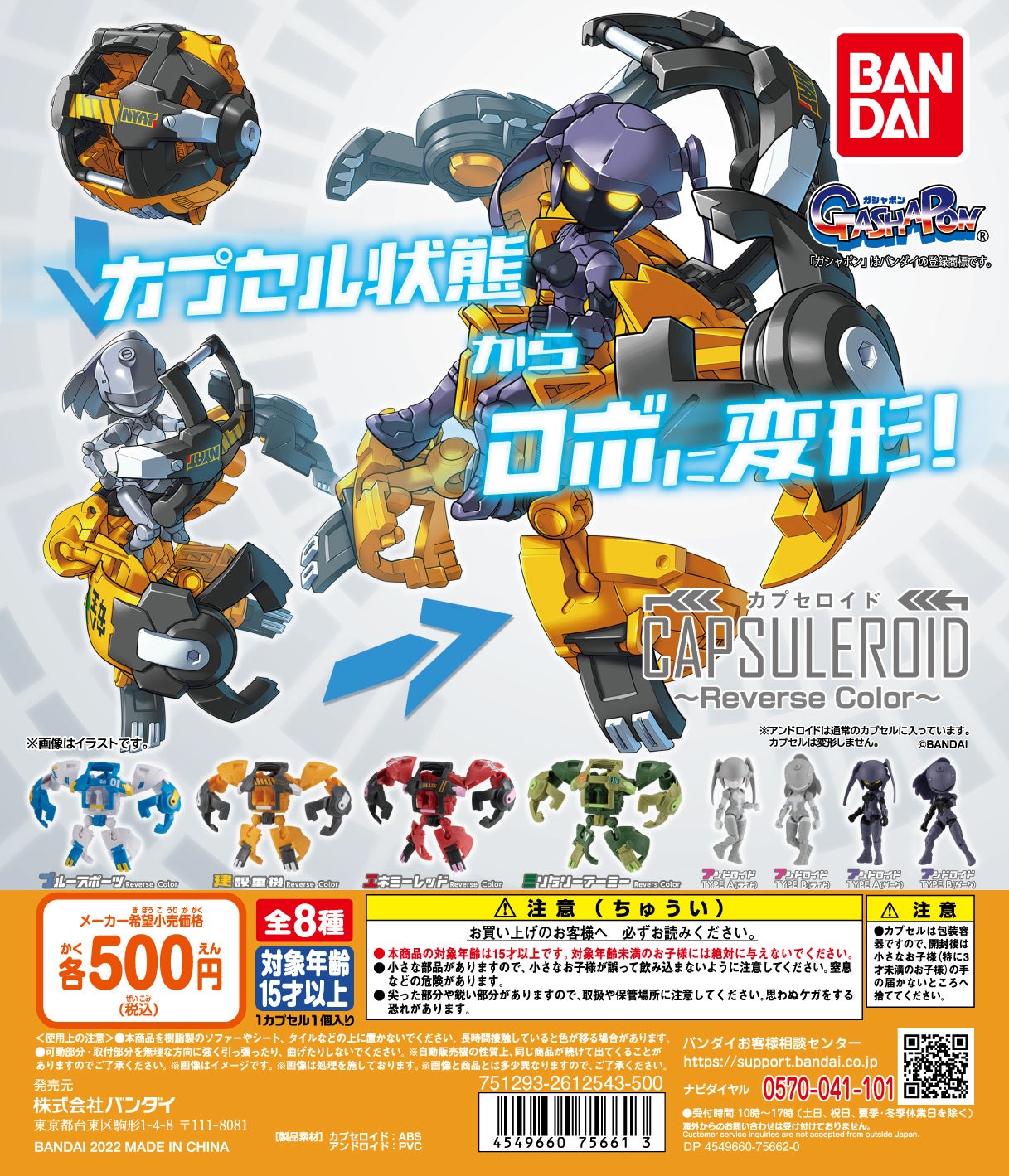 カプセル型の球体がロボに変形!!カプセルは3形態に変形。好評だった第一弾の反転カラーバリエーション。 カプセロイドのカラーバリエーションは全4種。搭乗するアンドロイドは形状2種、カラー2種の全4種。集めて自分好みにカスタマイズしよう!