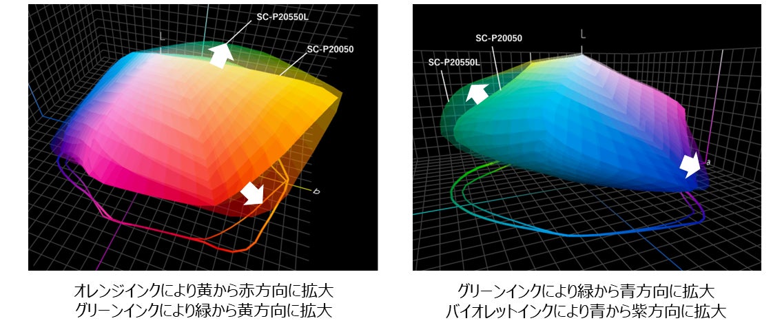 ・広い色再現領域を実現する特色インク「オレンジ・グリーン・バイオレット」を搭載。明るく鮮やかなグリーンからイエローの色域と、イエローからレッドの色域が劇的に拡大。さらにバイオレットインクの搭載で従来機「SC-P20050シリーズ」に比べ青、紫方向の色域も拡大しています。
