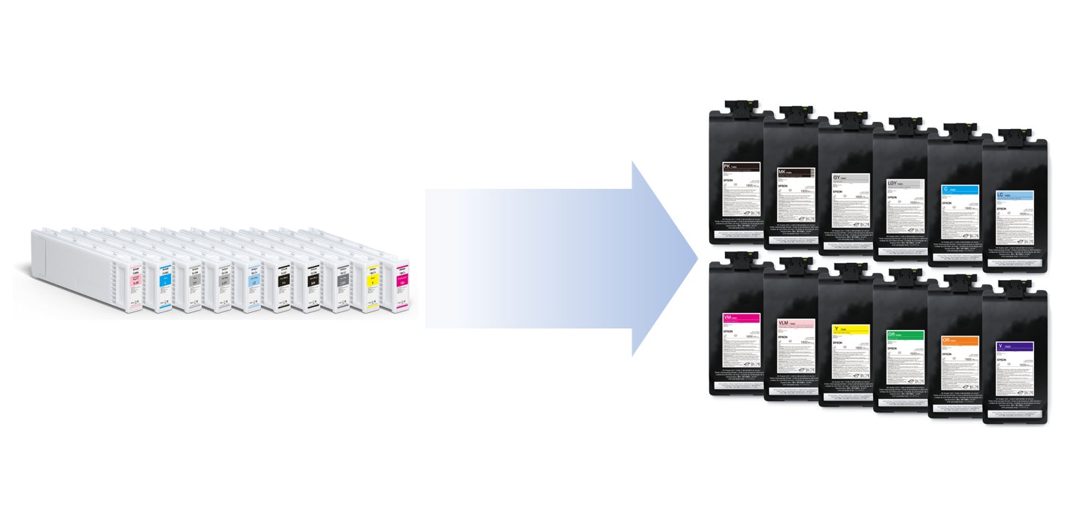 ・さらに、インクカートリッジからインクパック方式になることでインク1リットル当たりのプラスチック使用量が約90%削減(注6)。お客様の業務効率化に加え環境負荷低減にも貢献します。