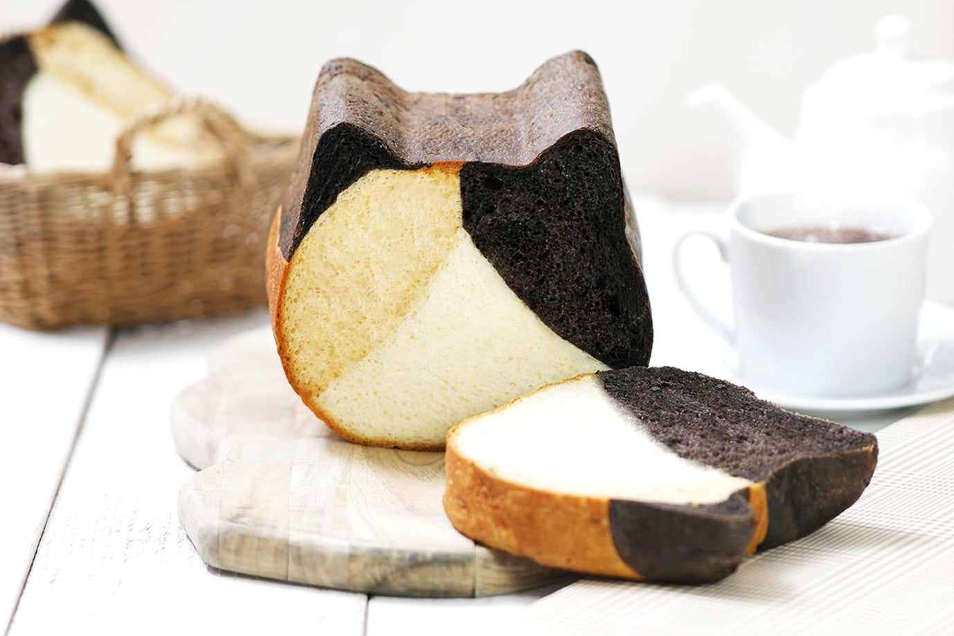 三毛猫の白、茶色、黒色模様をプレーン、キャラメル、ブラックココアで表現した見た目も三毛猫そのままなねこねこ食パンです。ミルク100%を使用した生地にキャラメルの甘みやほんのりビターなブラックココアの風味が合わさり、様々な味わいをお楽しみいただけます。