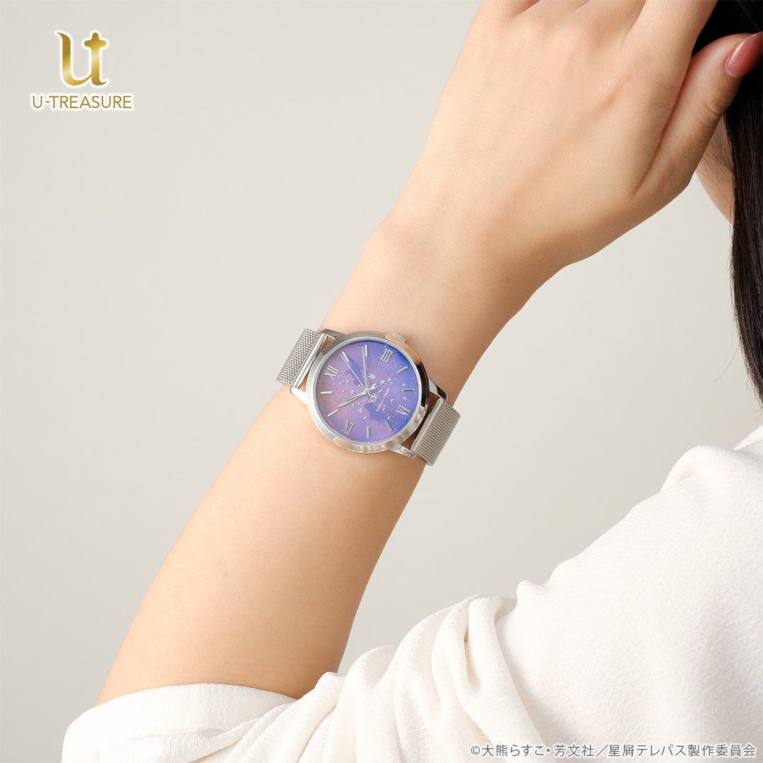 TVアニメ「星屑テレパス」青春ロケット腕時計。文字盤に『小ノ星海果』『明内ユウ』のシルエットをさりげなくデザイン。時針はウルトラハイパワードリィーム号、秒針は惑星をモチーフに