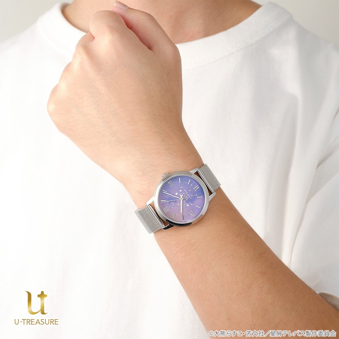 星屑テレパスの世界観を詰め込んだ腕時計。 文字盤には美しい宇宙が広がり、『小ノ星海果』『明内ユウ』のシルエットがさりげなくデザインされています。 時針はウルトラハイパワードリィーム号、秒針は惑星をモチーフに。 宇宙の上を移動するかのように時を刻みます。 デイリーユースに適したスタイリッシュ且つシンプルな、シルバーカラーで統一しました。 ベルトは使い勝手を考慮したステンレス製で、専用のボックスに入れてお届けします。 ふたりの宇宙への憧れを感じられる逸品です。 |