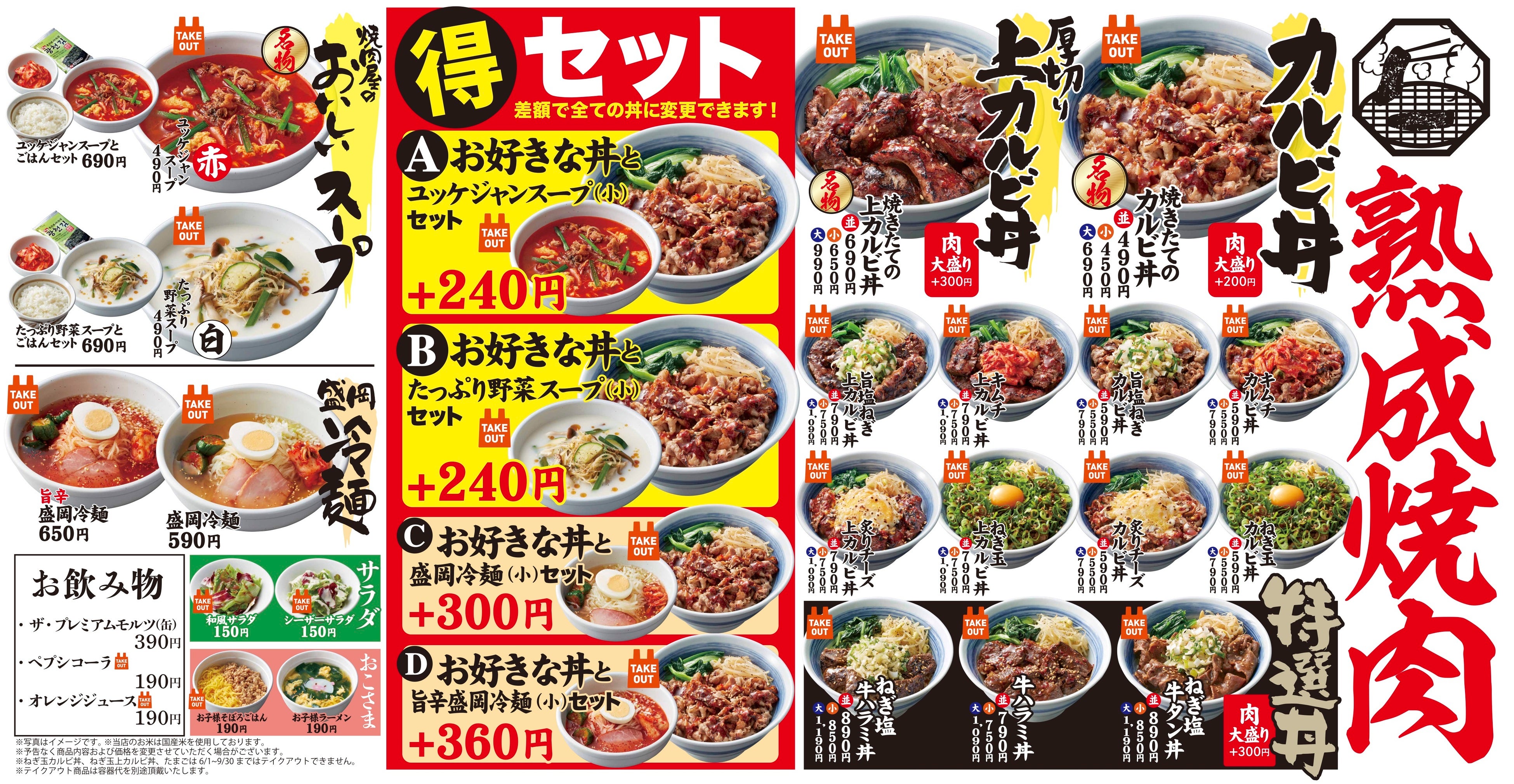 「焼きたてのカルビ丼」は490円(税込)から、「ユッケジャンスープ」は590円(税込)からご用意。またお得なセットメニューもあり、価格も大きな魅力の一つです。