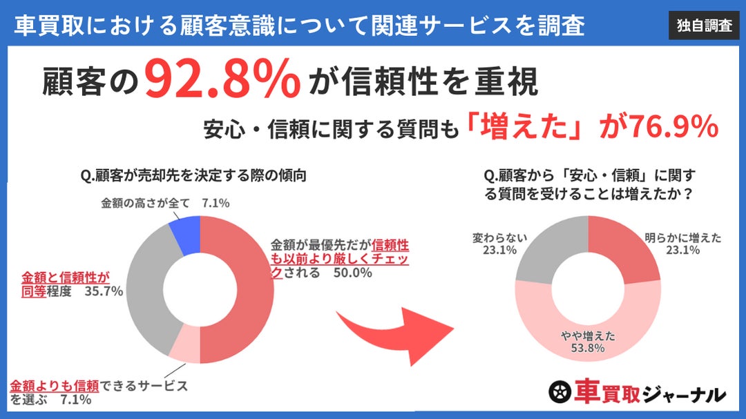 本調査の結果から、車買取市場においては「価格の高さ」だけでなく、「安心・信頼」がこれまで以上に重視される局面に入っていることが明らかになりました。