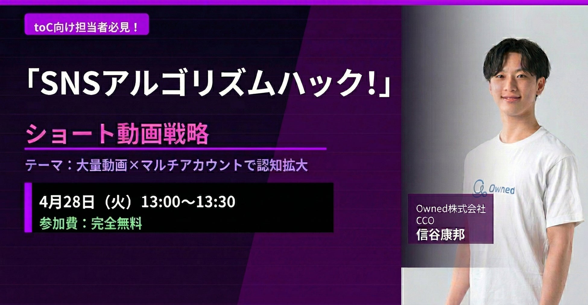 株式会社ベクトル(本社:東京都港区、代表取締役社長CEO:西江 肇司、東証プライム:6058)の子会社であるOwned株式会社(東京都港区、代表取締役社長、石井翔、以下「当社」)は、無料オンラインウェビナー「【2026年版】縦型ショート動画で加速させる『次世代集客』戦略 〜TikTok・リール・YouTubeショートを売上に直結させる具体的メソッド〜」を4月28日(火)13:00より開催いたします。