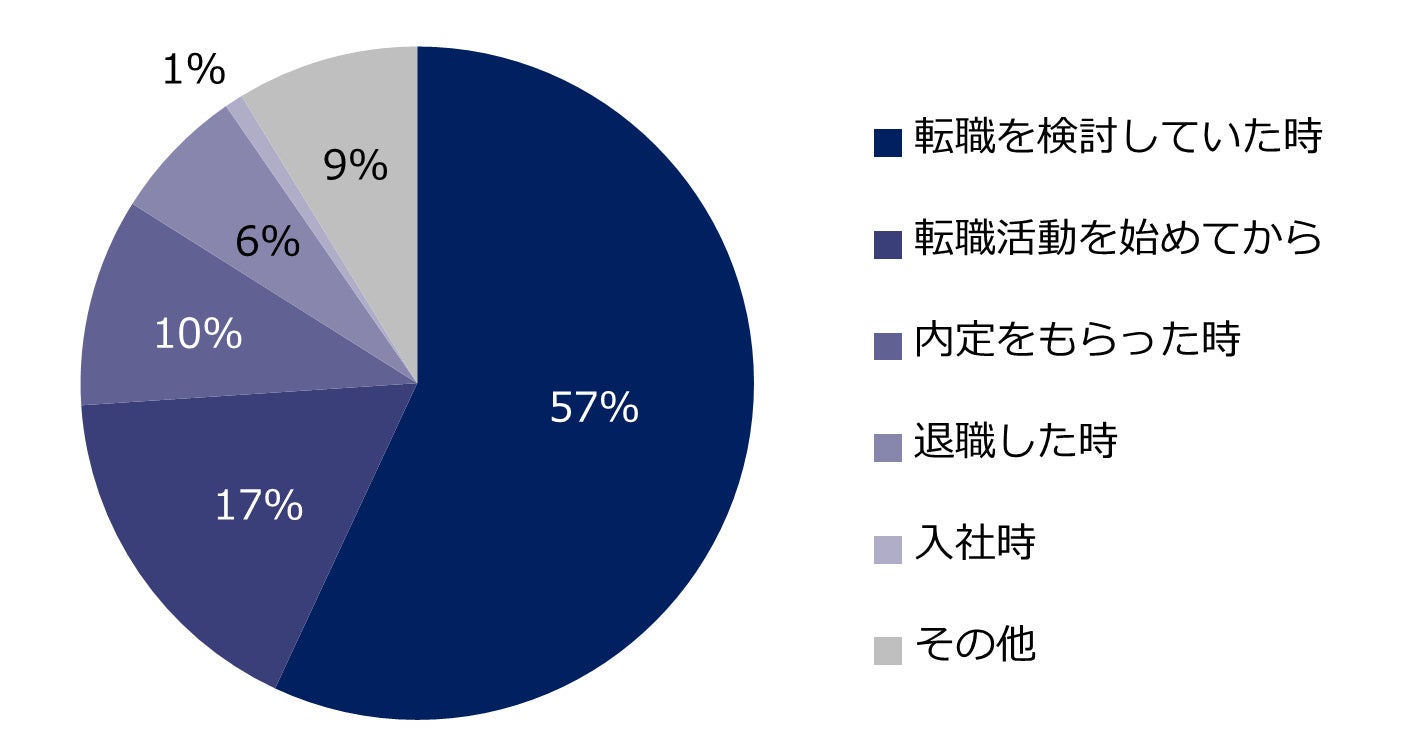 「これまでに家族に転職を反対された経験はありますか?」と伺うと、「ある」と回答した方は33%でした。2018年の同調査(※)では46%で、13ポイント減少する結果になりました。続けて「ご家族へ初めて転職について相談したのはいつ頃でしたか?」と伺うと、上位は「転職を検討していた時」(57%)、「転職活動を始めてから」(17%)で、7割以上の方が内定をもらうまでに相談していることが分かりました。