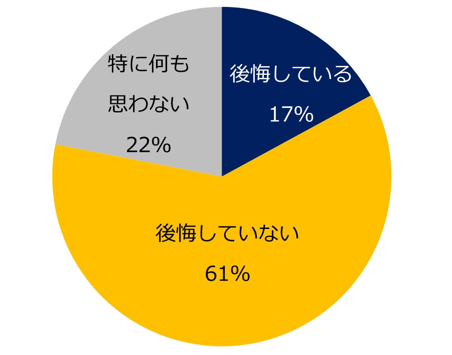 家族に転職を反対されたことがある方に「反対されたことを理由に内定を辞退したことはありますか?」と伺うと、辞退したことがある方は51%と半数で、2018年と同じ結果でした。続けて「内定先を反対された上でご自身がとった行動をどう思われますか?」と伺うと、61%が「後悔していない」と回答しました。