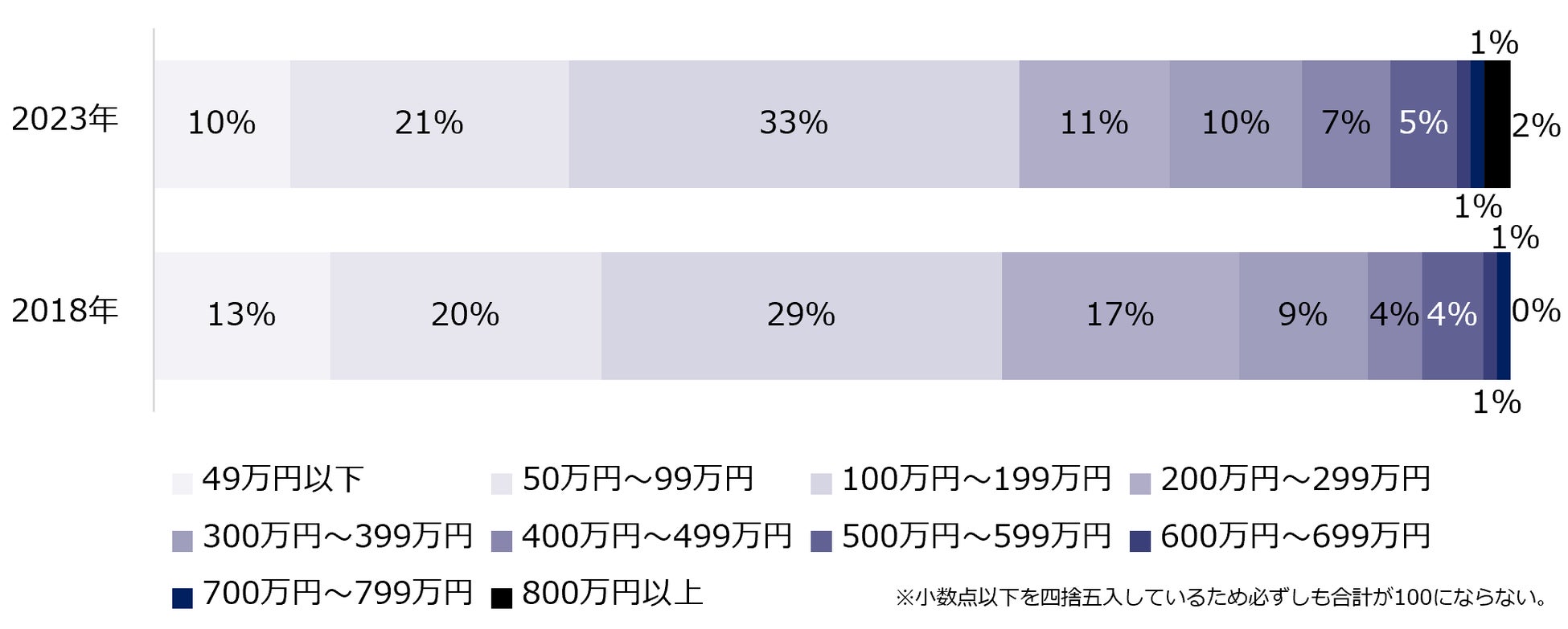 家族に転職を反対されたことがある方に、転職に反対した人物を伺うと、66%で「妻」が最多でした。続けて反対された理由を伺うと、上位は「転職自体に良くない印象がある」(44%)、「年収が下がる」(39%)でした。「年収が下がる」と回答した方に反対された年収引き下げ額を伺うと、2018年と変わらず「100万円~199万円」が最も多い結果となりました(2018年:29%、2023年:33%)。