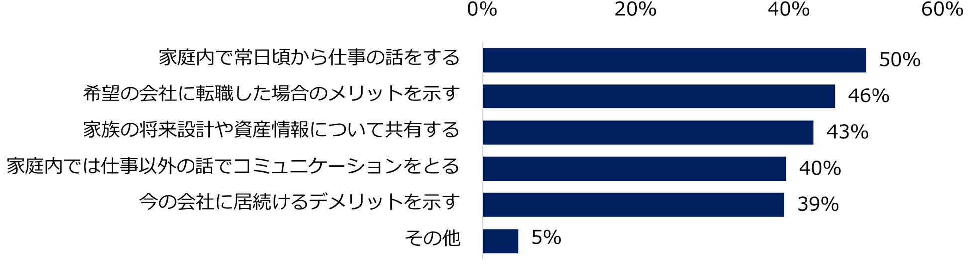 家族に転職を反対されず、応援してもらうために実施しておくべきことを伺うと、「家庭内で常日頃から仕事の話をする」が50%で最多。次点に「希望の会社に転職した場合のメリットを示す」(46%)が続きました。