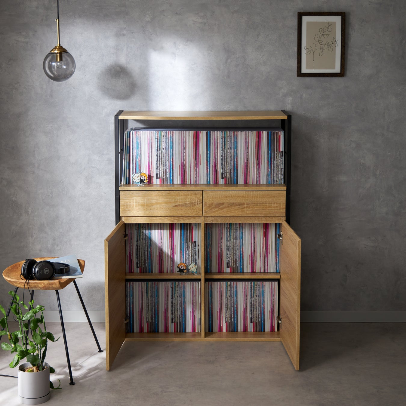 最大の特徴は、一見して「大量の同人誌が入っている」とは分からない、洗練されたインダストリアルデザインです。しかし、その内部にはB5サイズの同人誌(3mm厚)を約750冊収納可能な大容量スペースを確保。「推し活は全力で楽しみたいけれど、インテリアとしての美しさも譲れない」。そんな方々の願いを叶えます。上部の棚はあえて「抜け感」のある吹き抜け構造にし、視線を上に誘導します。