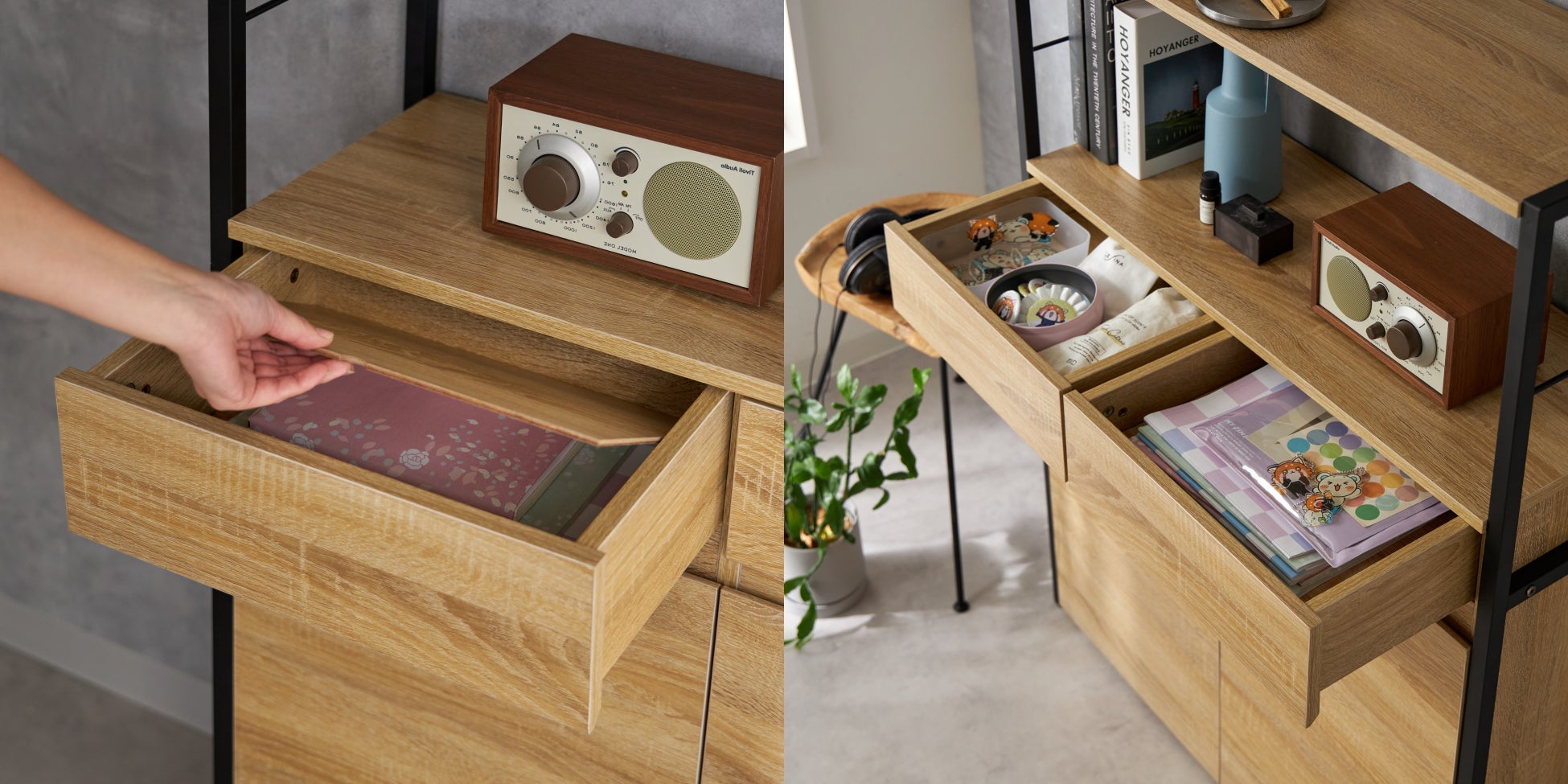 「家族に見られたくない」「自分の心の中だけに留めておきたい」。そんな特別な本のために、引き出し内部には「二重底」の隠しスペースを設けました。二重底の高さは冊数に合わせて2段階に調整が可能。大切な同人誌はもちろん、見られたくない物を保管する場所としても活用できます。このラックは単なる本棚ではなく、あなたの「推し活」と「プライバシー」を守る聖域です。