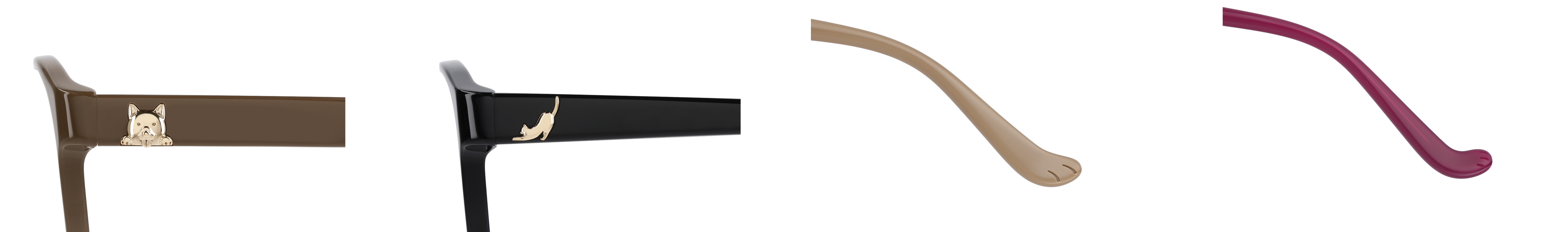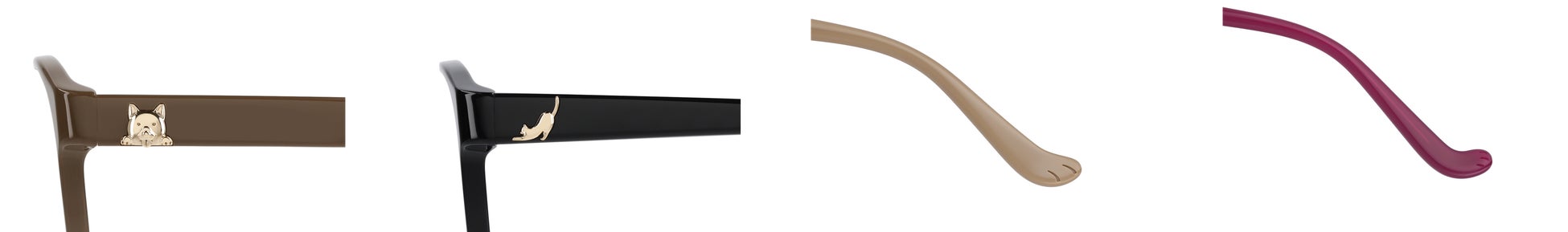 右のテンプル(つる)に犬や猫のZoffオリジナルピンが添えられた愛らしいデザインのフレーム。小ぶりなサイジングと乳白系のカラーリングを中心としたラインアップです。