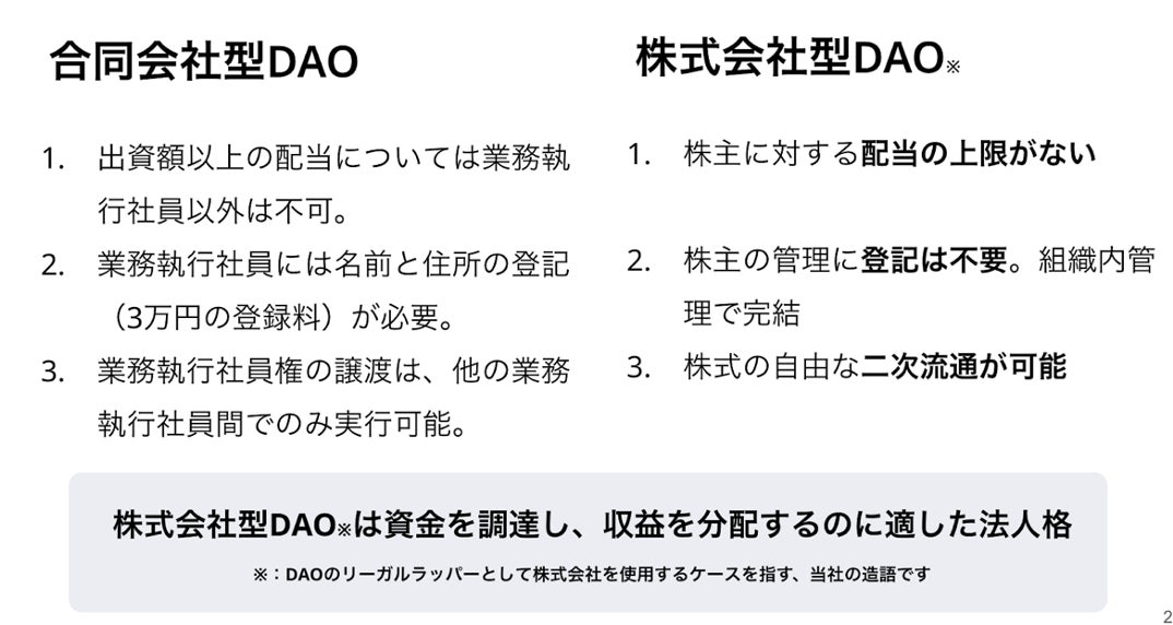 ※2:株式会社型DAOとは、DAOのリーガルラッパーとして株式会社を使用するケースを指す、当社の造語です
