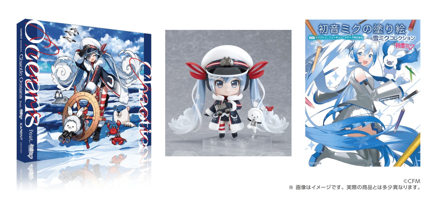 1.「SNOW MIKU 2022」雪ミクグッズセット「Chaotic Oceans feat. 初音ミク」&「ねんどろいど 雪ミク Grand Voyage Ver.」&「初音ミクの塗り絵 雪ミクコレクション(https://www.kawade.co.jp/np/isbn/9784309291765/)」(提供:クリプトン・フューチャー・メディア株式会社)