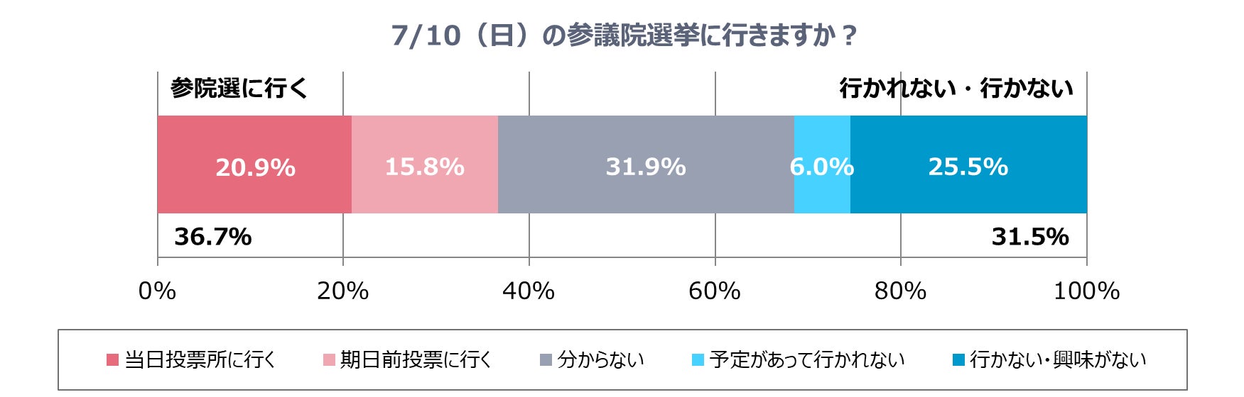 「当日投票所に行く」と答えた人は20.9%、「期日前投票に行く」と答えた人は15.8%、あわせて36.7%が7月10日の参院選に行くと回答しました。