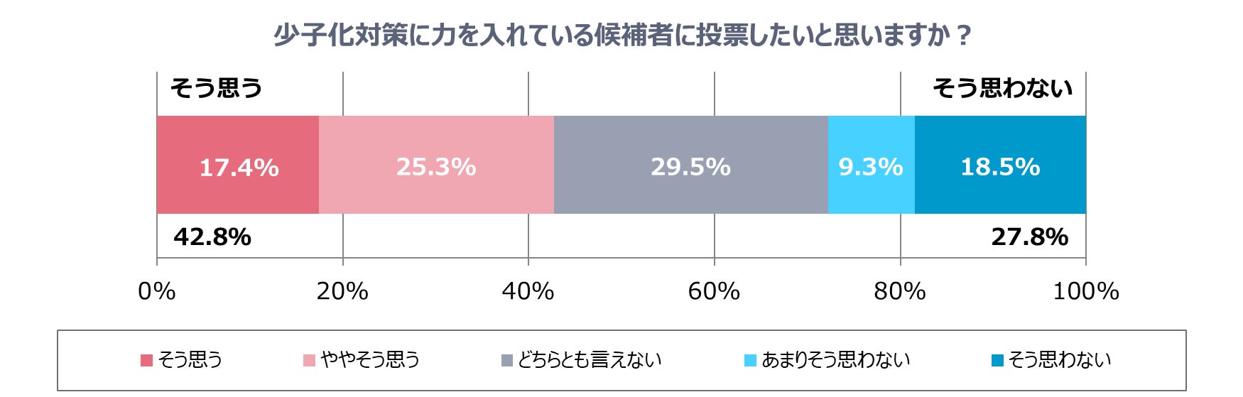 「そう思う」(17.4%)と「ややそう思う」(25.3%)をあわせた42.8%が候補者の少子化対策に注目していることが分かりました。