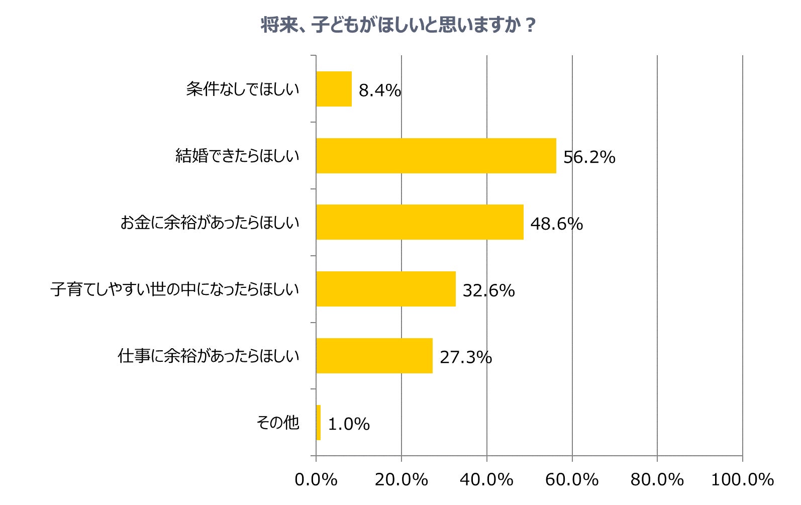 また、子どもがほしいと答えた人のうち、「結婚出来たらほしい」人は56.2%、「お金に余裕があったらほしい」人は48.6%、「子育てしやすい世の中になったらほしい」人は32.6%でした。