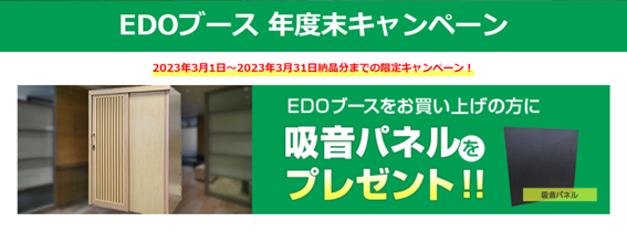 EDOブースをご購入いただいたお客様を対象に、EDOブース1名用1台につき1枚、EDOブース2名用1台につき2枚の吸音パネルをプレゼントいたします。