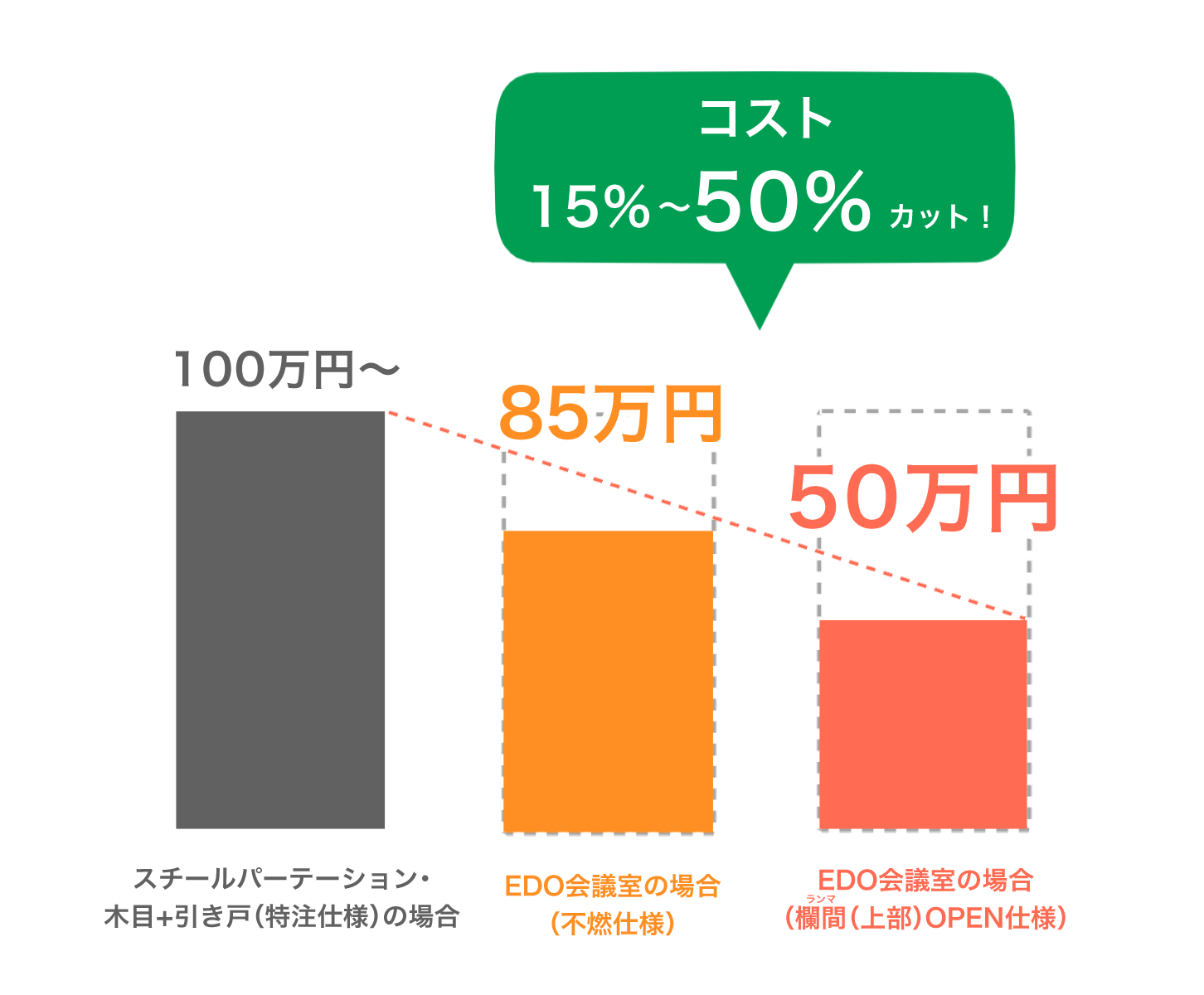 一般的なオフィスレイアウトに用いられるスチールパーティション(木目模様+引き戸の特注仕様)に比べ、15%~最大50%のコストカットを実現します。リノベーションを行うハードルを下げ、手軽にオフィスの雰囲気を一変させることができます。