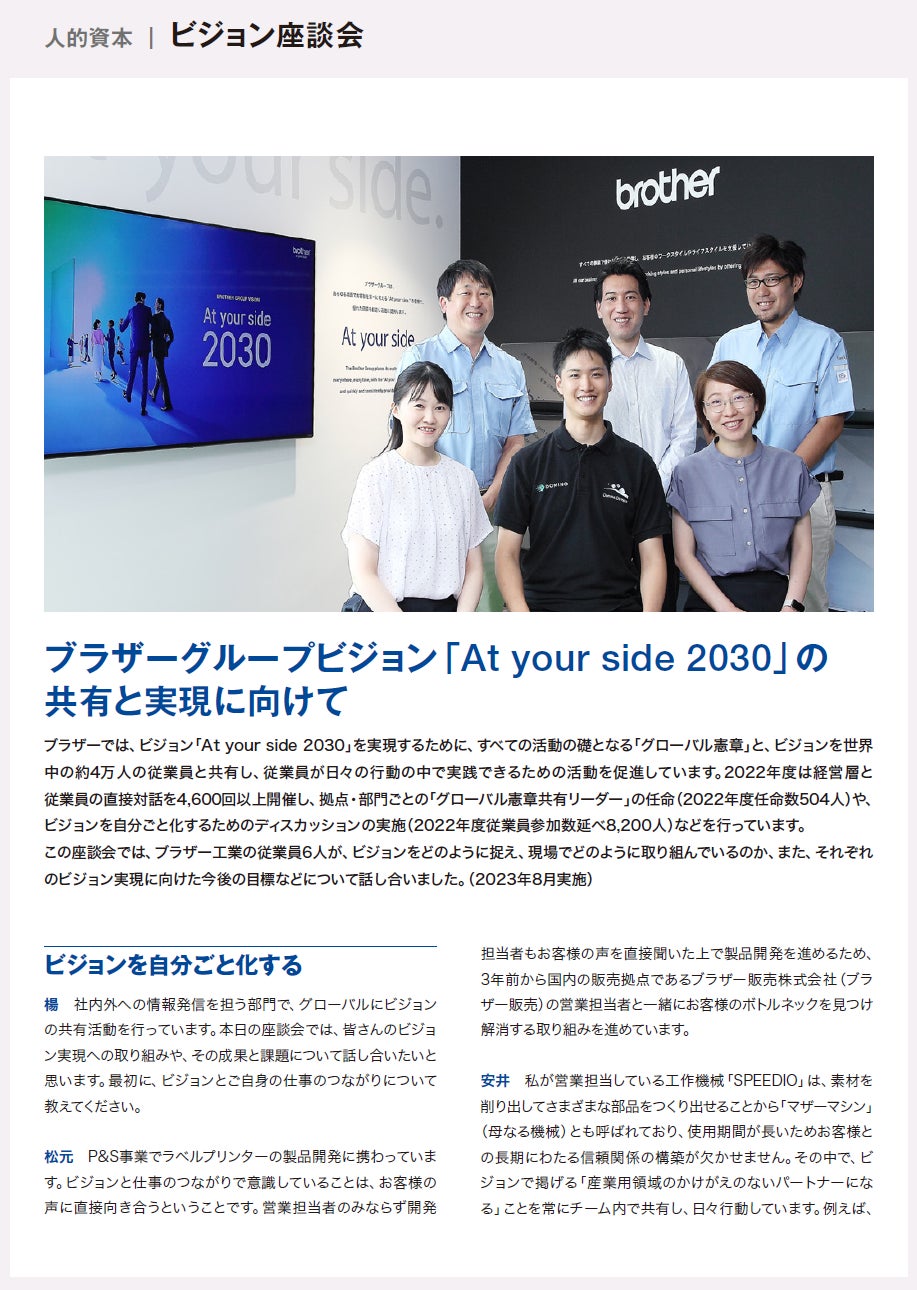「統合報告書2023」では新たに、2030年に向け、ブラザーの存在意義と社会への提供価値を示したグループビジョン「At your side 2030」実現への取り組みを、従業員が未来志向で率直に語り合ったビジョン座談会の内容を掲載している。また、グループビジョン実現に向け、バックキャストで最初の3年間に取り組むテーマを定めた中期戦略「CS B2024」の進捗と課題、企業価値向上に向けた取り組みなどについて、社外取締役と機関投資家が対話した内容も掲載している。