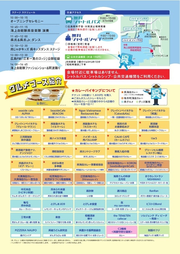(1) 呉海自カレーバイキング(呉海自カレー食べ比べ) (2) 呉グルメ・物産販売(市内飲食店をはじめとした50店舗が出店) (3) ステージイベント (4) 呉地方隊フリートフェスタ同時開催(艦艇一般公開等) (5) 海上保安庁巡視船一般公開 |