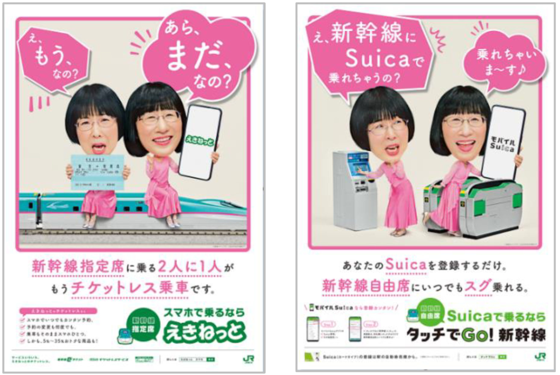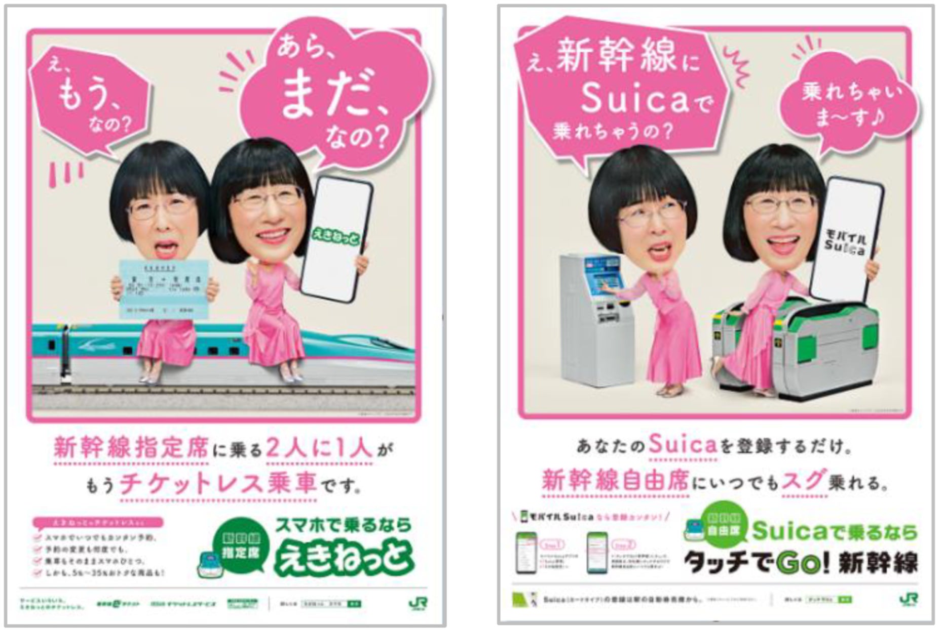 阿佐ヶ谷姉妹さんが出演するチケットレス商品の新動画「スマホで乗るならえきねっと」篇と、「Suicaで乗るならタッチでGo!新幹線」篇を、2023年7月3日(月)より配信しています。