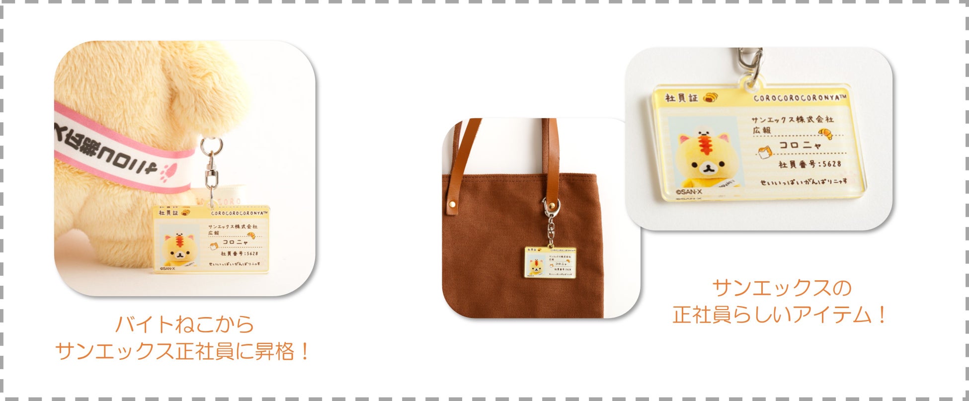コロニャは街角のちいさなパンニャ(屋)さんでのんびり暮らしているねこ。ひとみしりのコロニャは、いつも失敗作のコロネパンに隠れている。サンエックスネットショップでのバイトねこ経験を通じて頑張りを認められたコロニャは、2023年7月よりサンエックス広報に就任。サンエックスのキャラクターでありながら、自社の広報も務めている。ひとみしりながらも広報として取材を受けたり、イベントに出席したりと奮闘中。