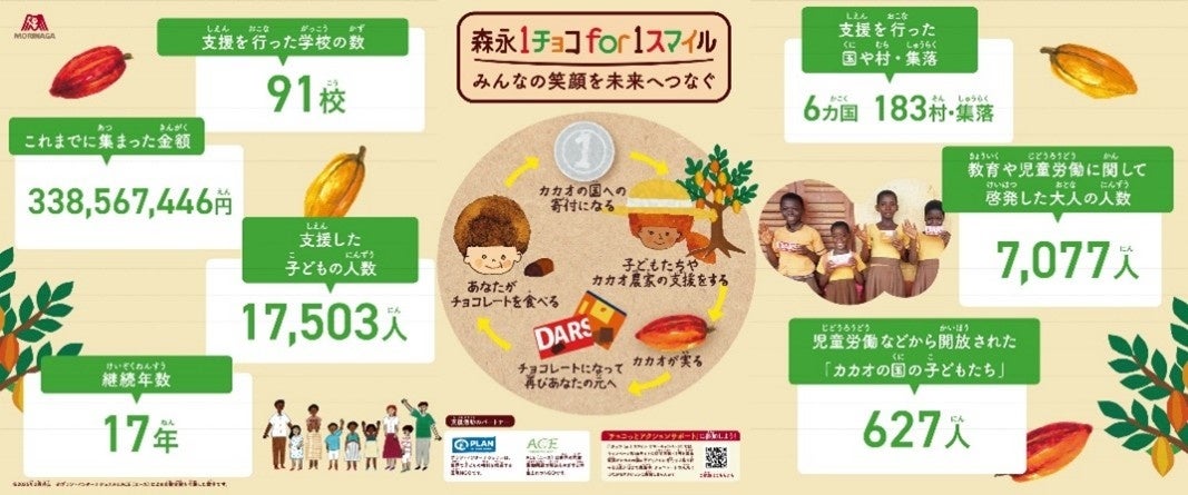 森永製菓株式会社(東京都港区芝浦、代表取締役社長COO・森 信也)は、カカオ産地の子どもたちを支援する活動「1チョコ for 1スマイル」の取り組みにおいて、「1チョコ for 1スマイルサマーキャンペーン(以下:本キャンペーン)」を7月3日(木)より開始し、9月16日(火)まで実施します。また、キャンペーン内の取り組みの一環として、7月5日(土)・6日(日)に開催される『学研キッズネットPresents 自由研究EXPO 2025』へ「森永製菓1チョコ for 1スマイルブース」を出展いたします。