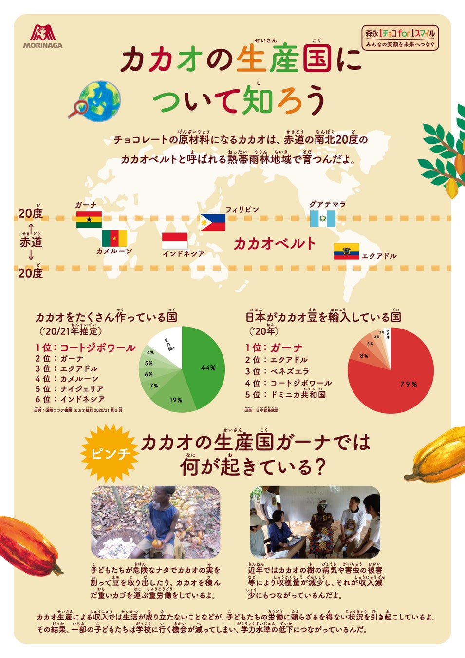 「1チョコ for 1スマイル」は、ガーナなどカカオの国の未来を担う子どもたちの教育環境の改善や児童労働問題への取り組み、またカカオ農家の収入向上に向けた取り組みを、商品の売り上げの一部などを使って支援しています。