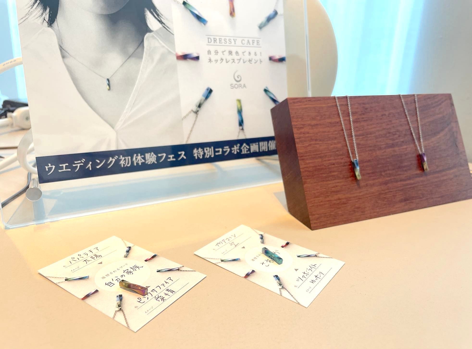 今回の開催では、ウェディング初体験フェスの大人気コンテンツでもある、スタートドレスフォトとあわせて、さらに、オーダーメイドブライダルジュエリー専門店SORAのネックレス発色体験を特典としてご用意。