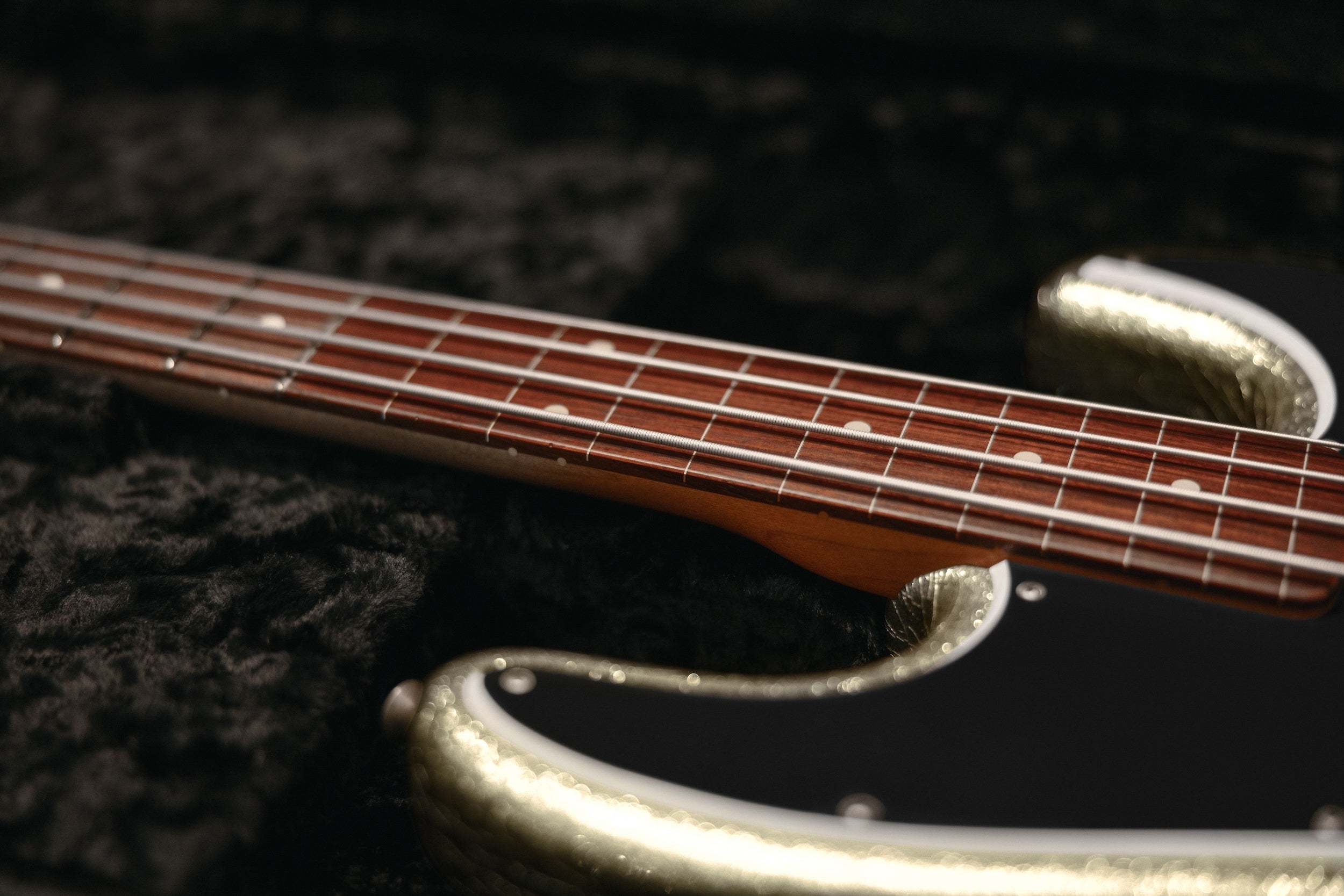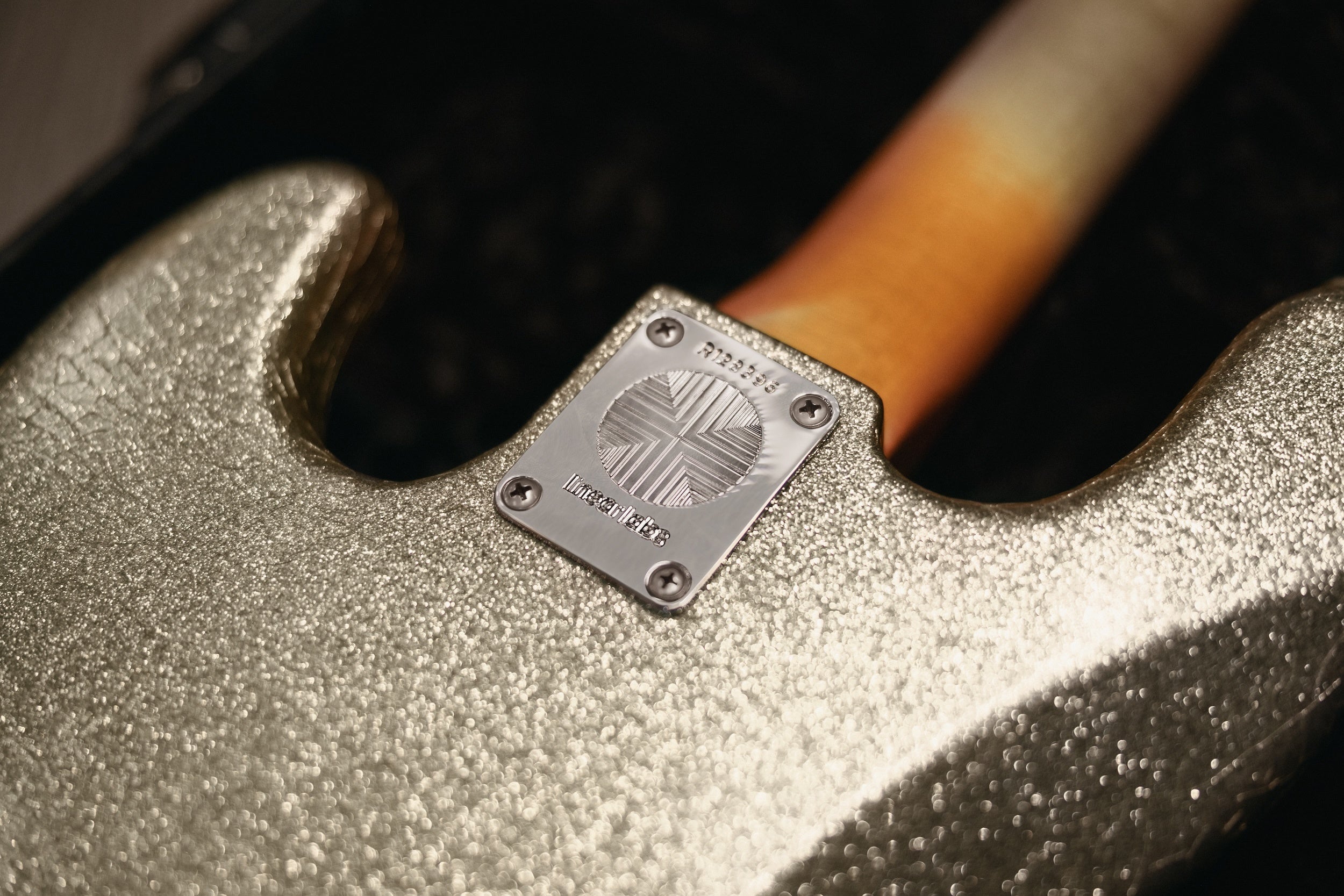 Fender Custom Shopマスタービルダーのリーヴァイ・ペリーは、エイドリアン・ヤングと緊密に協力し、2021年に制作された彼個人用の「Custom Shop Jazz Bass®」を忠実に再現しました。その特徴的なJourneyman Relic® Aged Silver Sparkleラッカーフィニッシュは、ダークローズウッドの指板、わずかに酸化処理されたハードウェア、ブラックのピックガードと美しく調和しています。ピックアップもジャズベースとしてはユニークな構成となっており、よく見られる2基のシングルコイルピックアップではなく、Custom Shop Hand-Wound ‘62 Split Single-Coil Precision Bass®ピックアップとCurtis Novak BS-DSピックアップが搭載され、温かく丸みのあるローエンドと滑らかでパンチの効いたミッドレンジを奏でます。トーンの幅を広げるのは2つの内蔵エフェクト、エイドリアンのお気に入りのヴィンテージエフェクトをベースにした60年代風のファズとスクエア波トレモロです。各エフェクトは、マスターボリュームとトーンノブに“隠された”プッシュ/プルトグルで簡単に切り替え可能です。指板10フレット以降のフレットレス部と組み合わせて使用することで、1970年代前半のファジーなファンクグルーヴから、スペース感のあるシンセサイザーのようなメロディへとシームレスに移行できます。