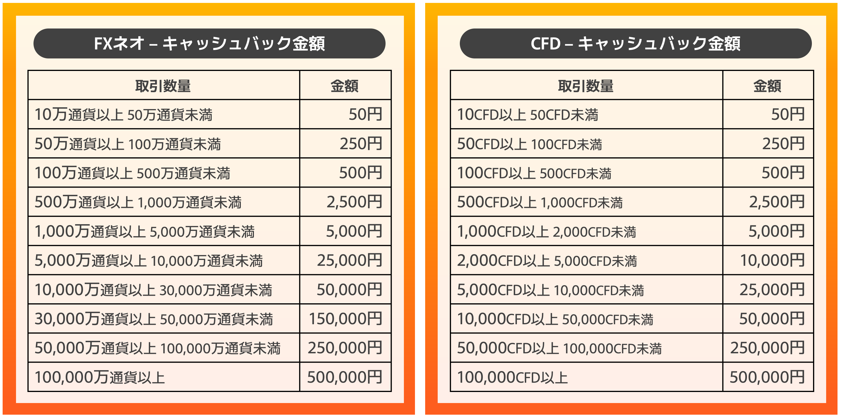 期間内のFXネオ取引数量に応じて最大50万円をキャッシュバックいたします。