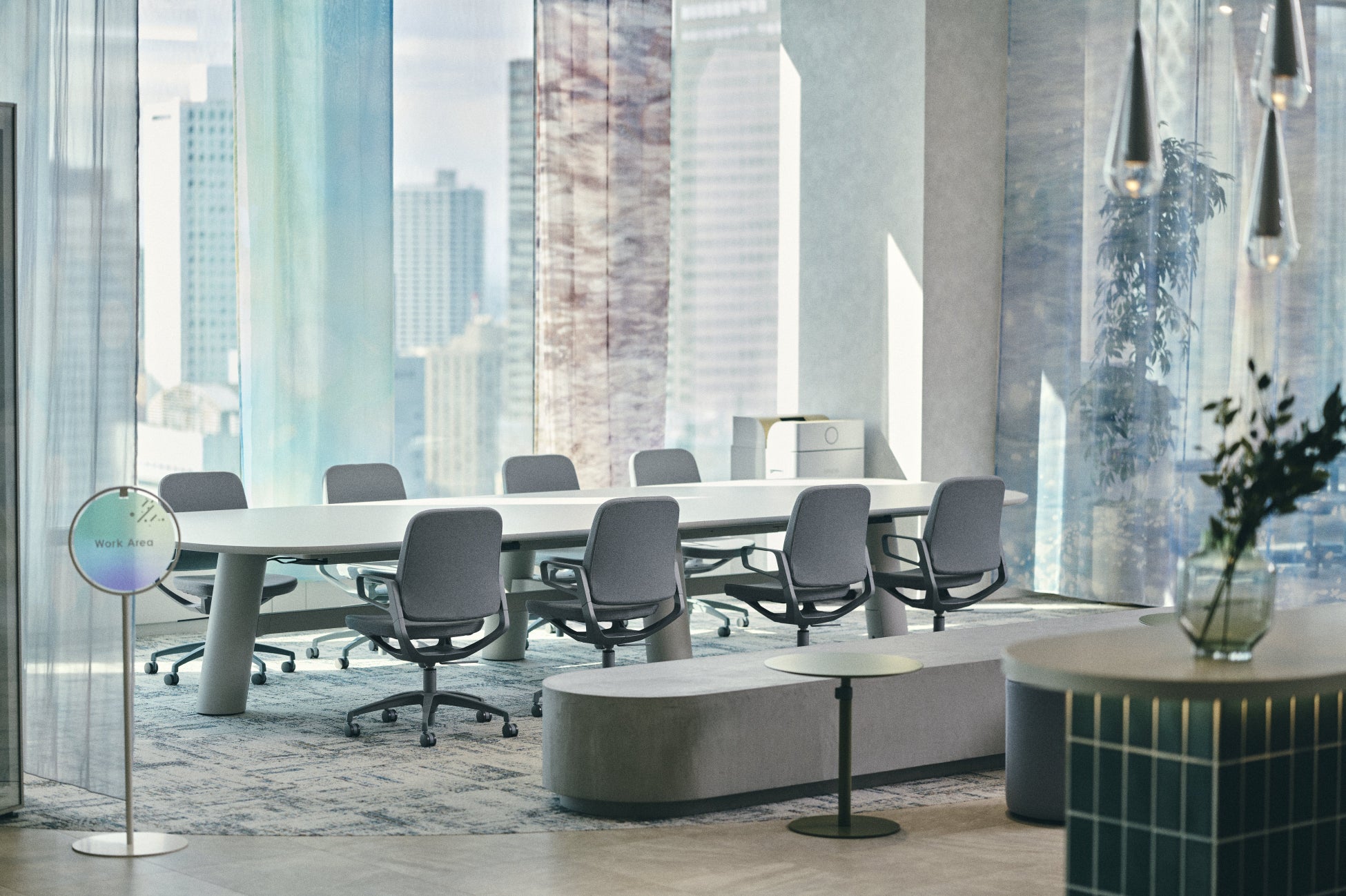 Epson XaILabは、ビジネスパートナーとの対話や価値創出を促す拠点として再構築された空間です。エプソン販売の創業地・信州の自然を着想源に、青緑やグレーを基調とした透明感のある場を形成。木やガラスなどの素材を重ね、有機性と先進性が共存する印象にまとめています。また、拠点名「XaILab」に込められた“彩”の思想を起点に、技術やアイデアが広がっていく世界観を空間全体で表現。カーテンに昇華転写、サインにUV印刷を取り入れるなど、エプソン販売の技術を空間のディテールにも織り込んでいます。
