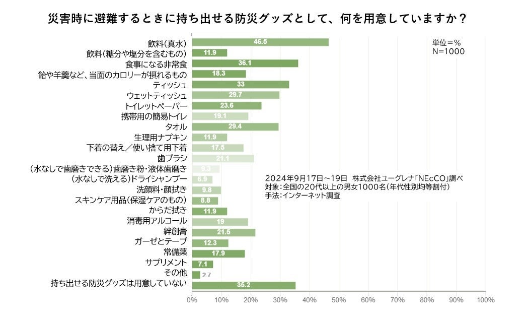 株式会社ユーグレナ(本社:東京都港区、代表取締役社長:出雲充)の展開する、石垣島ユーグレナを原料としたスキンケアブランド「NEcCO(ネッコ)」が2024年9月に全国の20代以上の男女1,000名を対象に実施したインターネット調査では、災害時の避難するときに持ち出せる防災グッズを、「用意していない」と回答した人は35.2%。災害時への備えをしていないという人がまだ3割以上いることがわかりました。