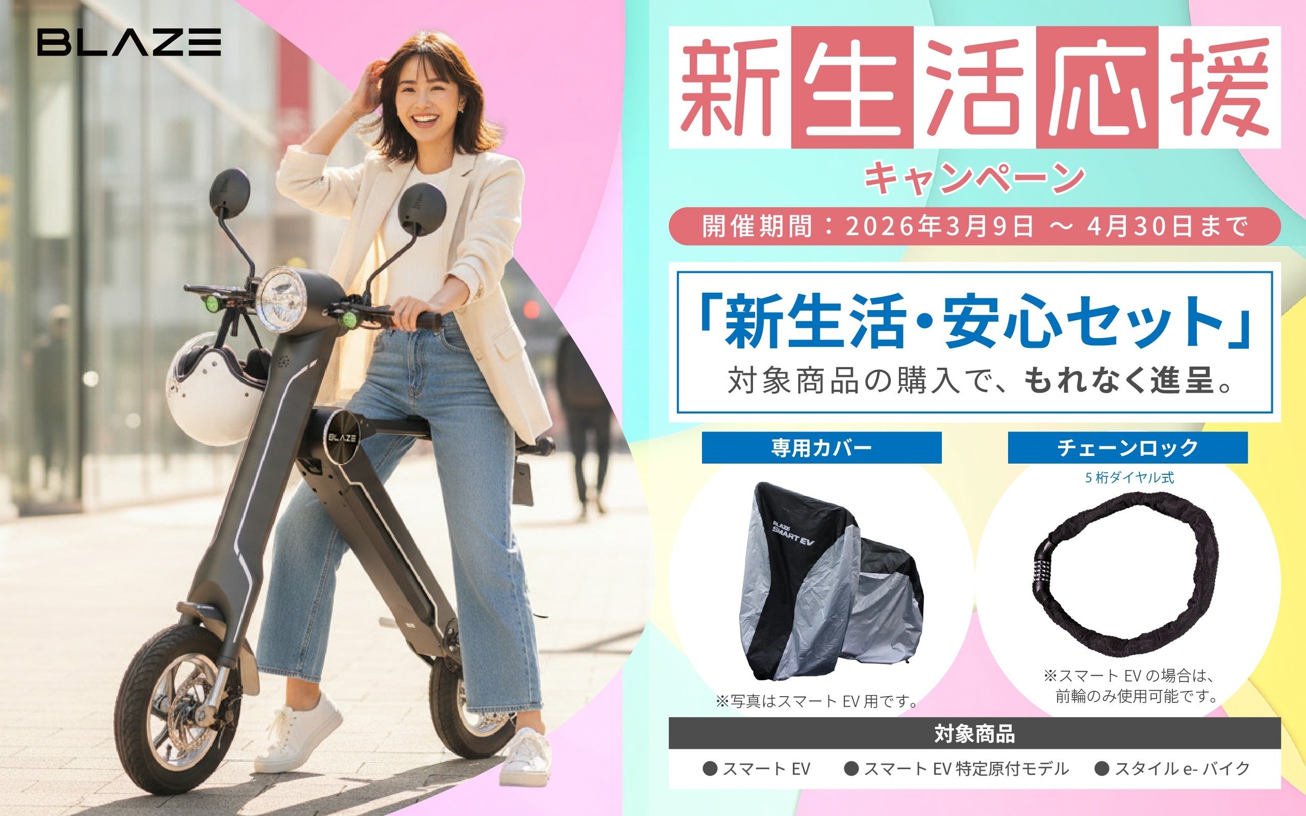 株式会社ブレイズ(愛知県名古屋市、代表取締役:市川 秀幸、以下 ブレイズ)は、2026年3月9日(月)~ 4月30日(木)の期間限定で、ブレイズの2輪電動バイク「スマートEV」・「スマートEV 特定原付モデル」、および電動アシスト自転車「スタイル e-バイク」の購入者を対象とした「2026新生活応援キャンペーン」を実施いたします。