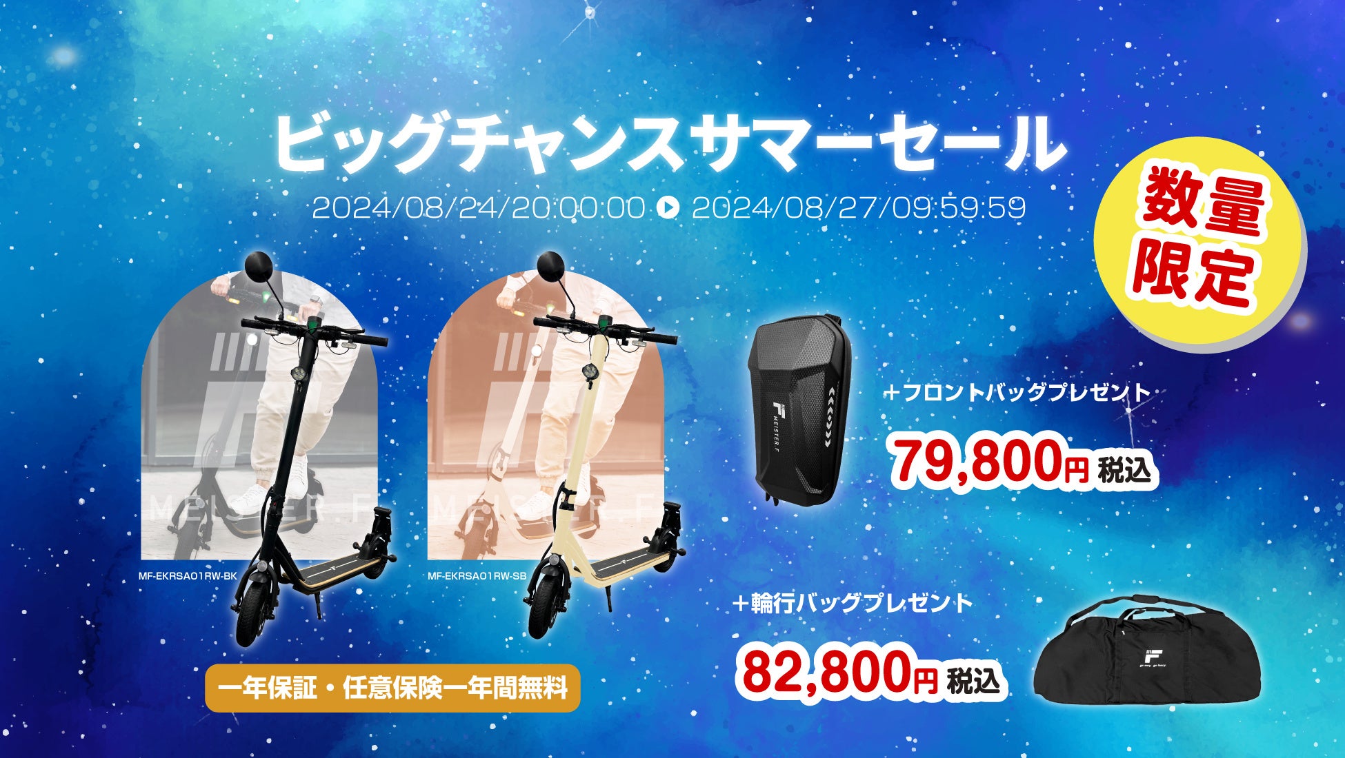 楽天「Show !t」では明日8月24日20:00~8月27日9:59のお買い物マラソンに参加、期間中に特定小型電動キックボードを購入すると、フロントバッグが0円、輪行バッグが3000円で入手可能。任意保険が1年間無料キャンペーンも継続中!、まもなく行楽シーズン、MEISTER.Fの電動キックボードでお出かけをぜひお楽しみください。
