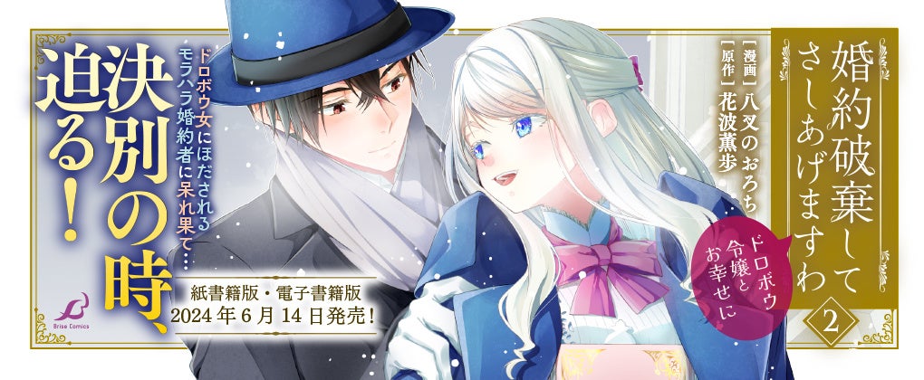 ブリーゼコミックスは、なんと新刊が2か月連続重版!『婚約破棄してさしあげますわ ~ドロボウ令嬢とお幸せに~』1巻に続き、2巻も発売即重版決定!