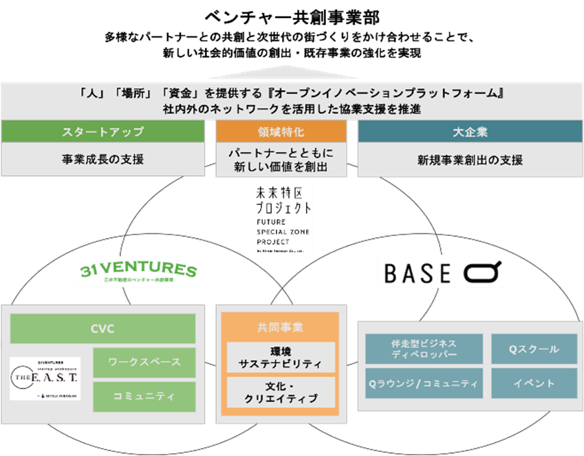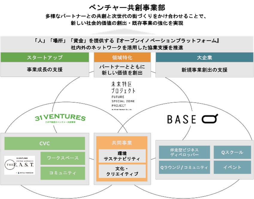 本事業を推進するベンチャー共創事業部は2015年に設立され、新しい社会的価値の創出・既存事業の強化を目指し、「31VENTURES」「BASEQ」「未来特区プロジェクト」の3つの事業を軸に多様なパートナーとの共創によるオープンイノベーションを推進しています。