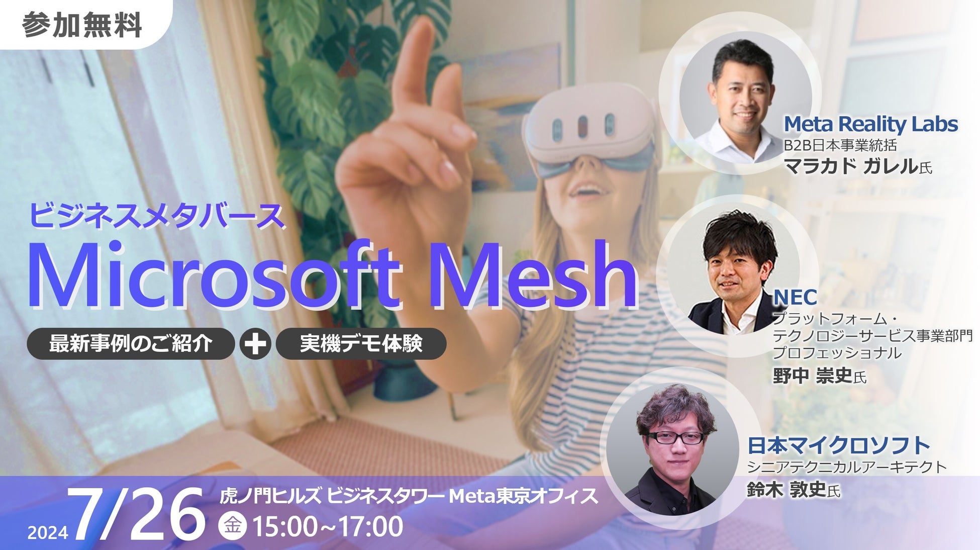 ビジネスメタバース「Microsoft Mesh」の最新事例をご紹介するイベントを、SB C&S主催のもと、Meta日本法人、日本マイクロソフト、NECの3社共催で開催します。