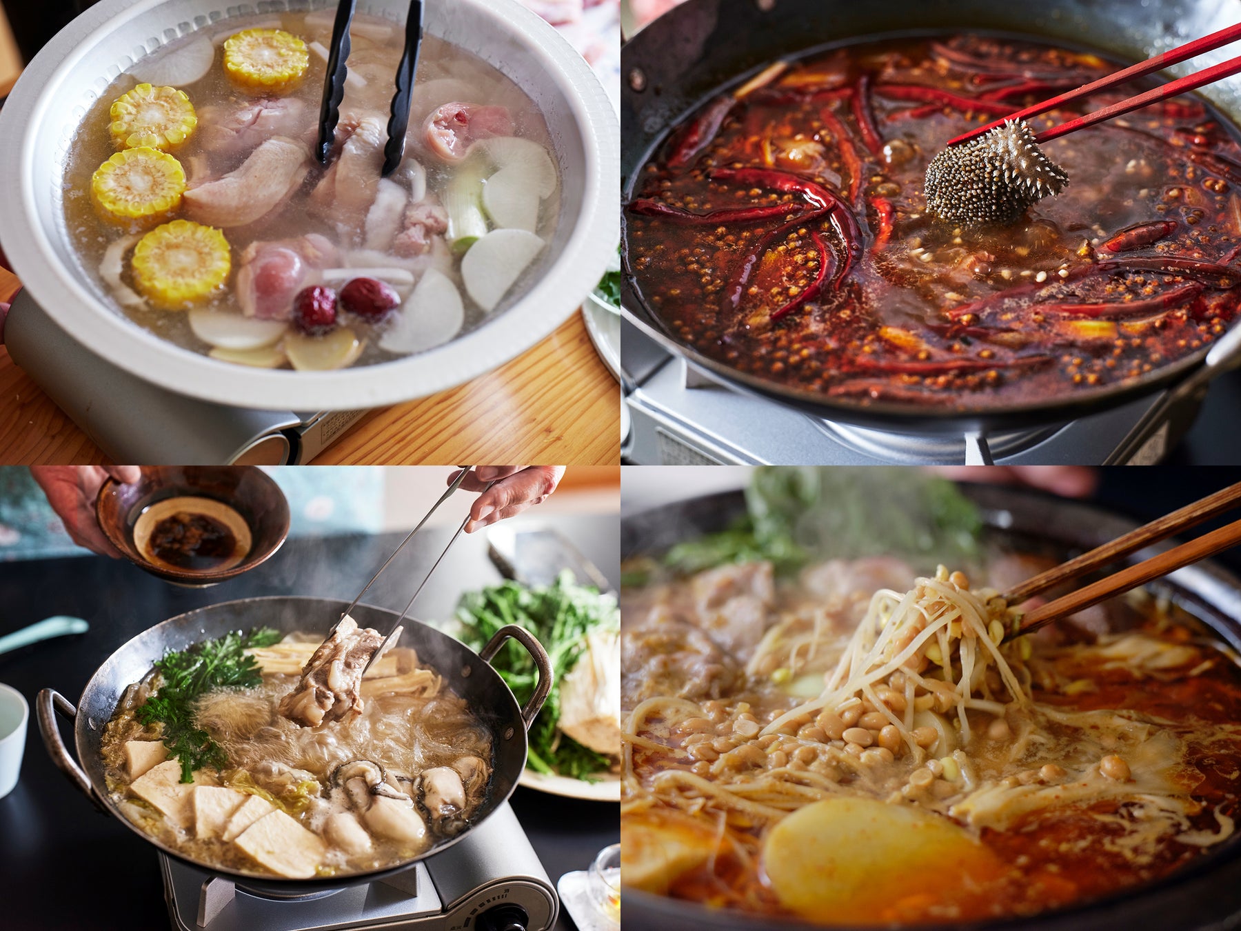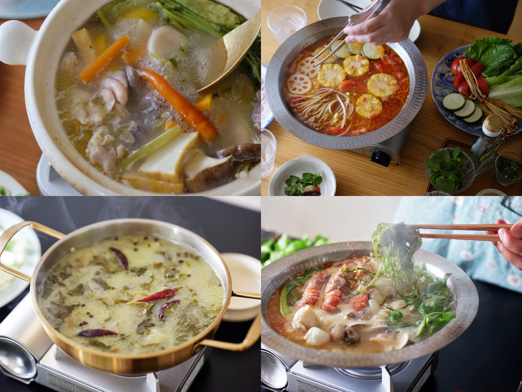 梅雨には重慶式の麻辣火鍋で湿気を吹き飛ばし、夏には貴州省に学ぶ発酵トマトの爽やかな火鍋でさっぱりととのう。実りの秋は雲南省の山盛りきのこ鍋で濃厚なうまみを堪能し、冬は東北地方の知恵が詰まった発酵白菜と豚肉の鉄鍋煮込みで体の芯から温まる。