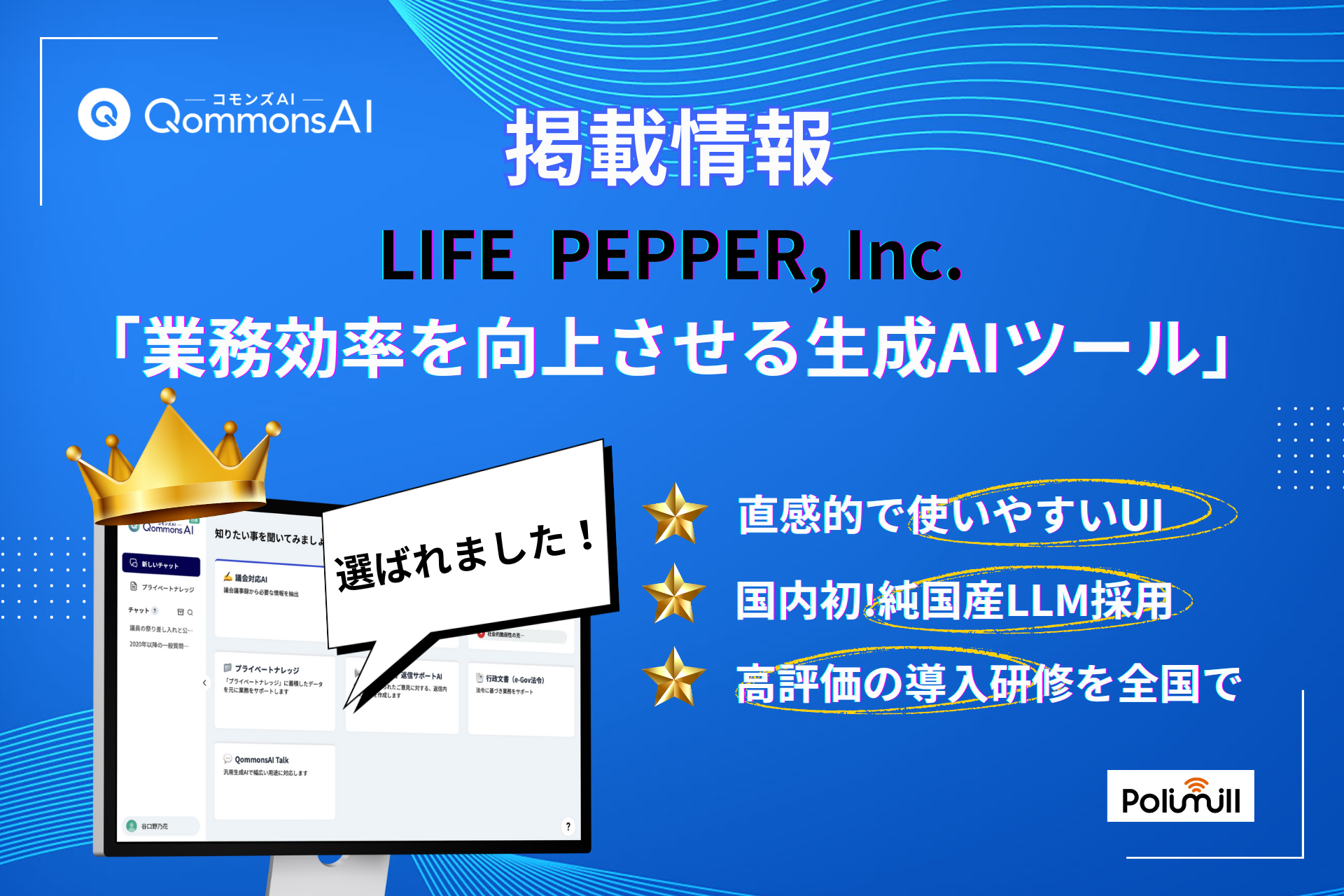 Polimill株式会社(本社:東京都港区、代表取締役:伊藤あやめ/谷口野乃花)が提供する行政専用生成AI「QommonsAI(コモンズAI)」が、海外デジタルマーケティング支援を行うLIFE PEPPER株式会社が選定した「業務効率を向上させる生成AIツール50選」サイト内に掲載されました。