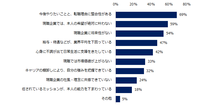 また、転職すべき理由も伺ったところ、トップ3は「今後やりたいことと、転職理由に整合性がある」(69%)、「現職企業では、本人の希望が絶対に叶わない」(59%)、「現職企業に将来性がない」(54%)でした。