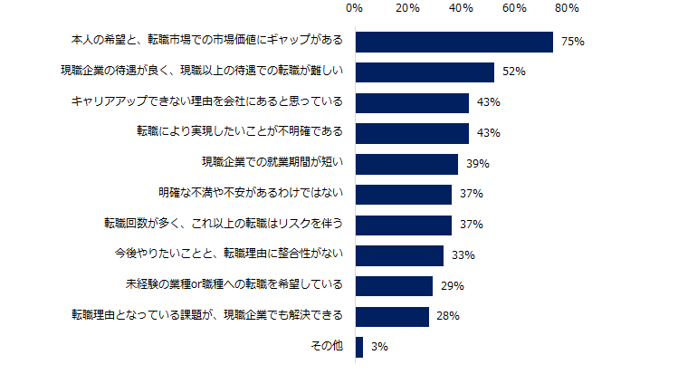 現職にとどまるべき理由を伺ったところ、最多は「本人の希望と、転職市場での市場価値にギャップがある」(75%)でした。次いで、「現職企業の待遇が良く、現職以上の待遇での転職が難しい」(52%)が続きます。具体的な事例と、転職コンサルタントが求職者へ行なったアドバイスも紹介します。