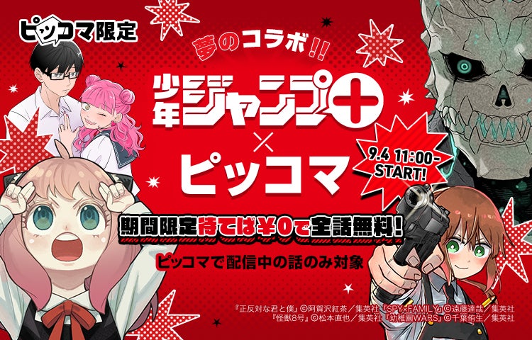 ピッコマ、9/4から「少年ジャンプ+」との夢のコラボ企画を実施!ピッコマ限定で『SPY×FAMILY』や『怪獣8号』など超人気10作品が期間限定、ピッコマで配信されている話が「待てば¥0」で全話無料